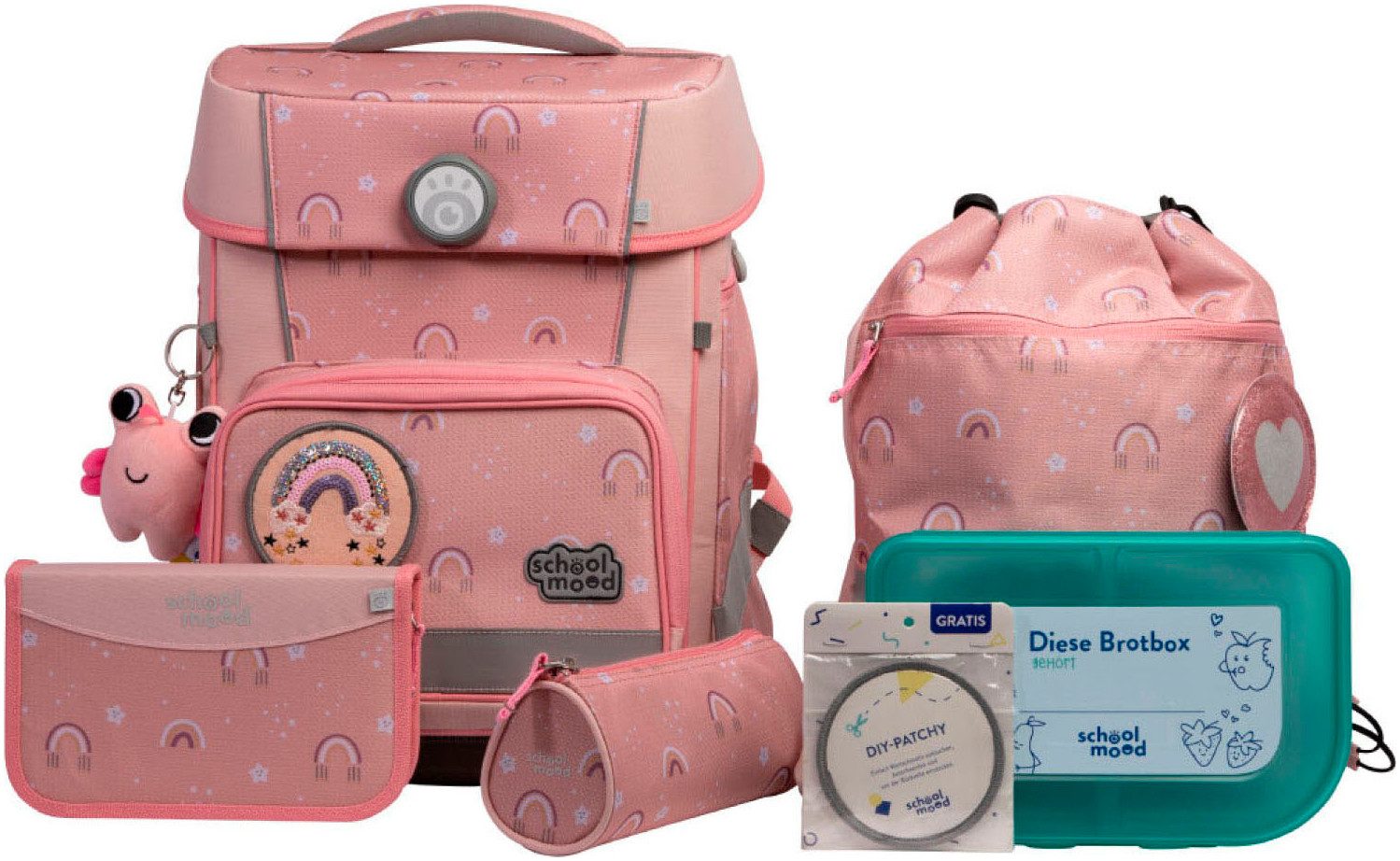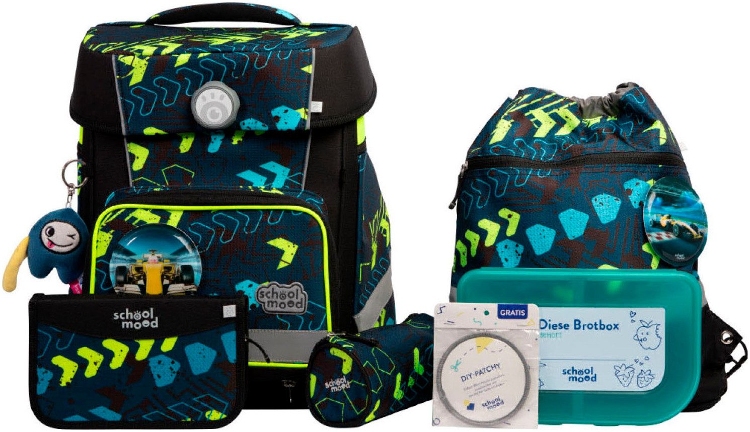 Lieferumfang | Die Rückgabe beinhaltet das Gesamtangebot. Turnbeutel, Etui (21-tlg., Markenfüllung von Eberhard Faber), Schlamperrolle, Brotdose, 3-tlg. Patchy-Set, LED-Patchy und einen Plüschanhänger "Moodie" |
