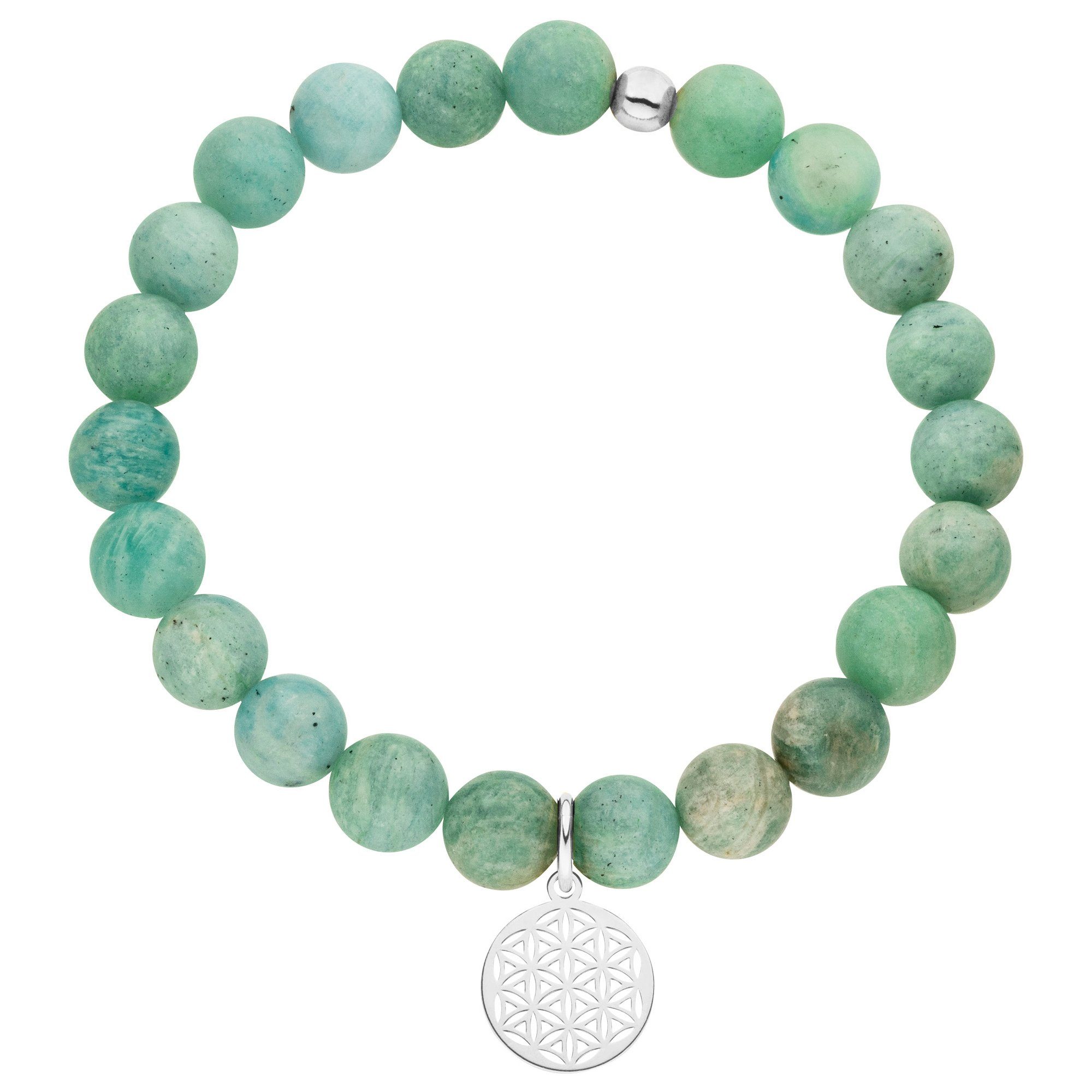 Dieses trendige Schmuckstück ist ein Stretch-Armband, gefertigt aus Amazonit-Perlen und 925er Silber. Es verfügt über einen zarten Anhänger in Form einer Lebensblume, ebenfalls aus vergoldetem 925er Silber.