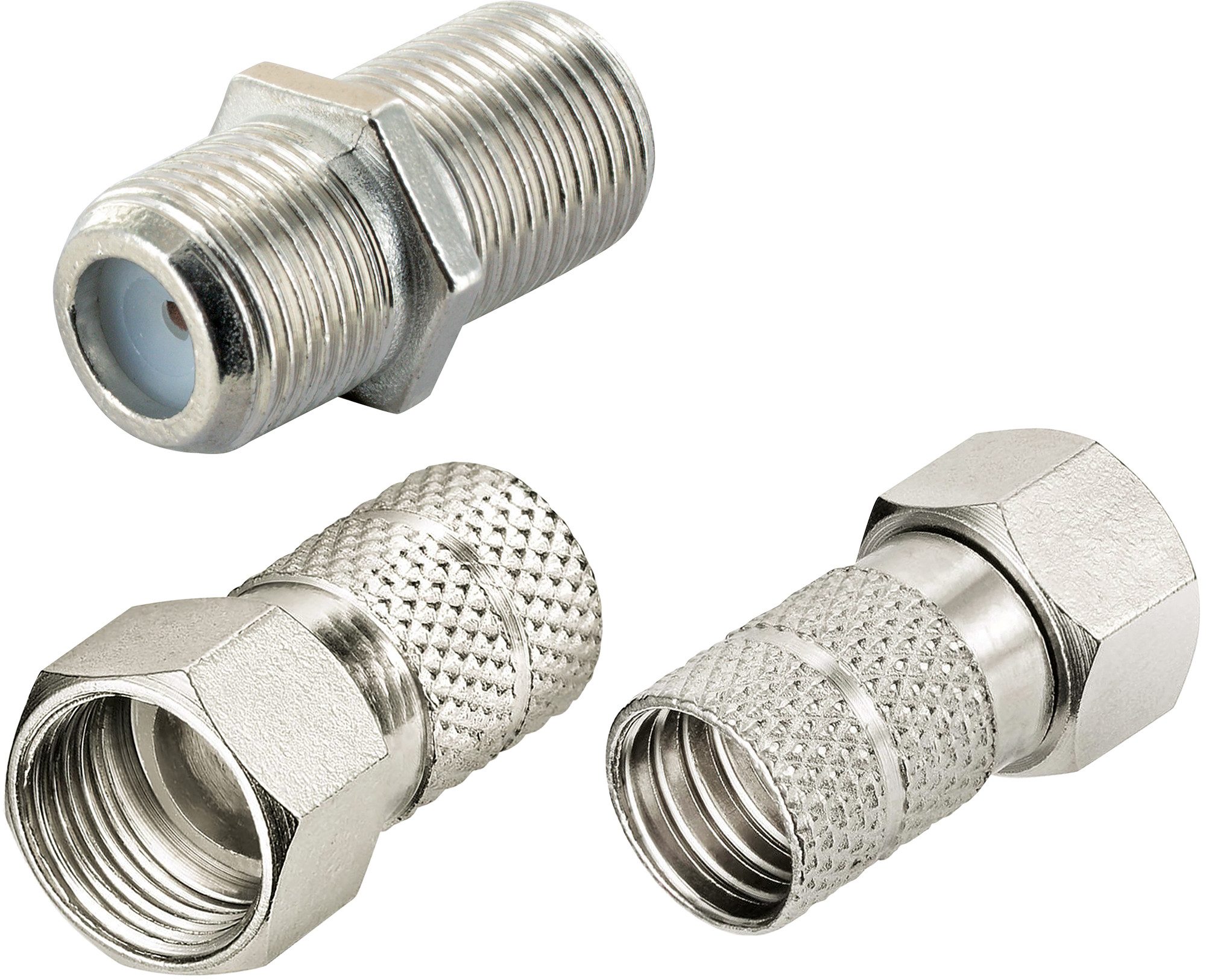 Dieses SCHWAIGER® Komplettset beinhaltet zwei F-Stecker, die für die Installation an einem Koaxialkabel geeignet sind, und einem F-Verbinder, der als Zwischenstück zur Verlängerung von SAT Anschlusskabeln mit F-Steckern dient.