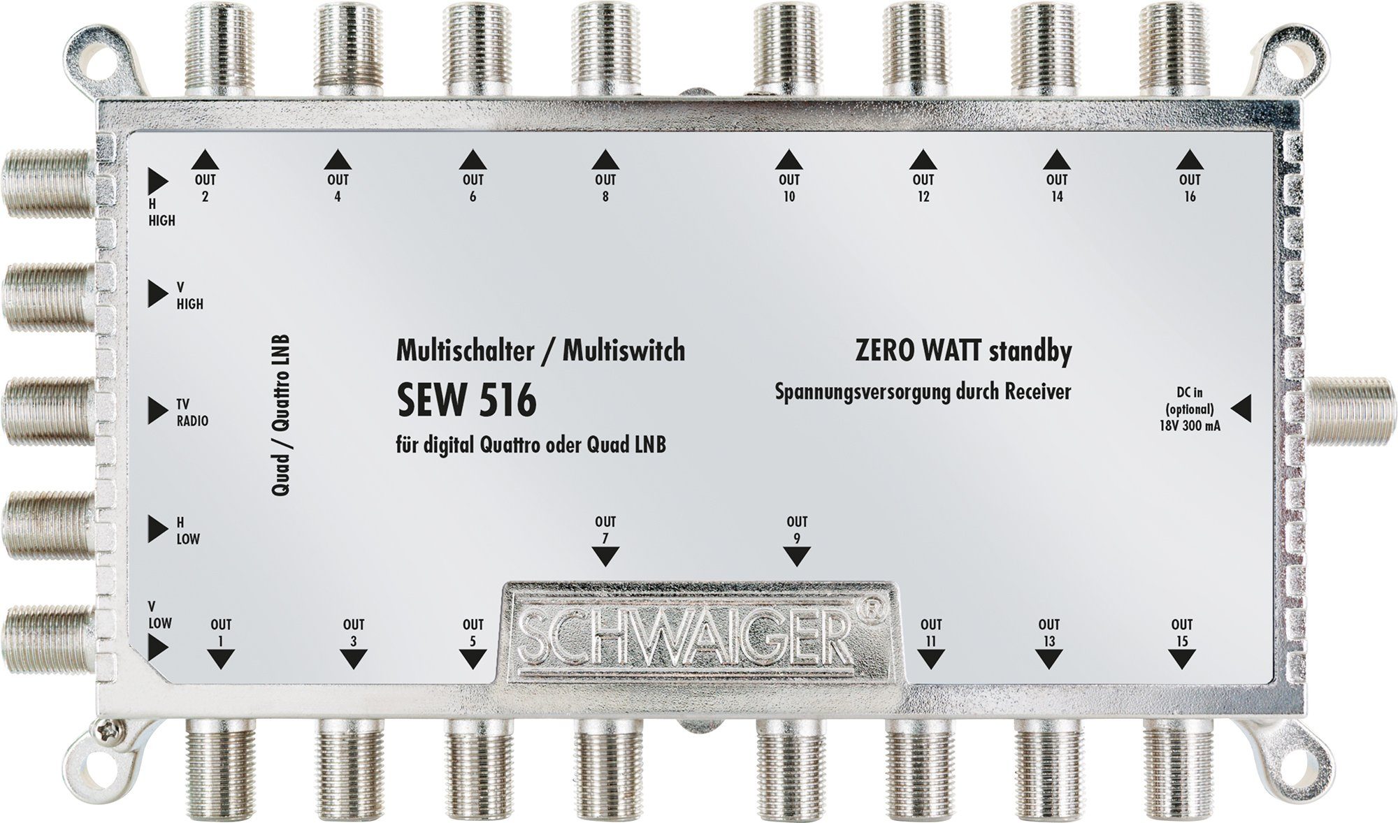 Dieser SCHWAIGER® Multischalter verteilt digitale Signale von einer Satellitenposition auf bis zu 16 Teilnehmer. Für die Signaleinspeisung kann sowohl ein Quattro als auch ein Quad-LNB verwendet werden. Все Teilnehmer können unabhängig voneinander die volle Programmvielfalt nutzen. Dieser Multischalter wird rein über die angeschlossenen Receiver mit Strom versorgt. Ist kein Receiver eingeschaltet, ist der Standby Verbrauch des Multischalters und des angeschlossenen LNBs 0 Watt.