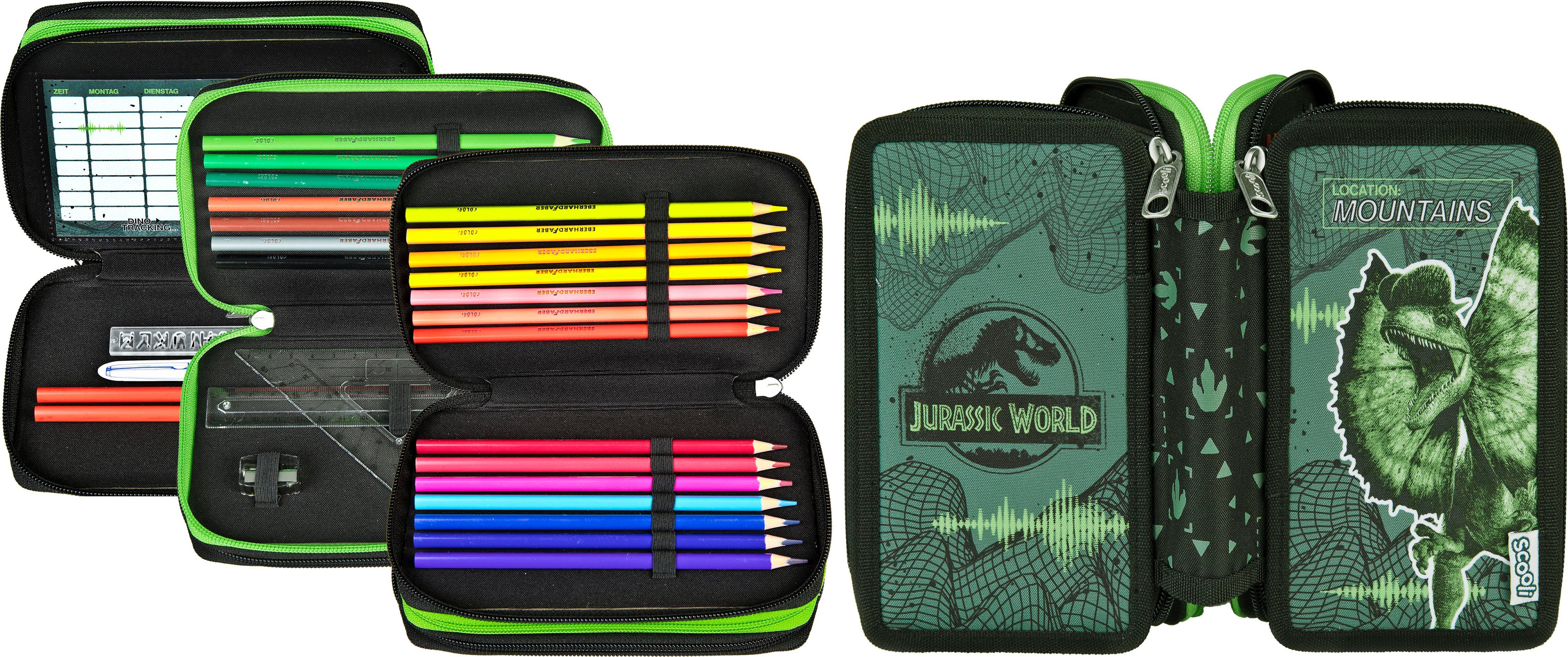 In dem Scooli Tripledecker Schüleretui mit Jurassic World Motiv sind alle Stifte schnell griffbereit. Das Etui bietet in drei Fächern viel Platz für Stifte, Lineal oder Spitzer. Für Ordnung sorgen die Stifteschlaufen. Das Federmäppchen kommt gefüllt mit 21 hochwertigen dreikant Buntstiften von Eberhard-Faber, 2 dreikant Bleistifte von Eberhard-Faber, einem Radiergummi, einem 17 cm Lineal, einem Spitzer, zwei ABC-Schablonen, einem Geodreieck und einem Stundenplan im Jurassic World Design. Der Stundenplan befindet sich in einem Sichtfensterfach und kann bei Bedarf ausgetauscht werden. Die Eberhard Faber Stifte sind aus 52% recyceltem Material.