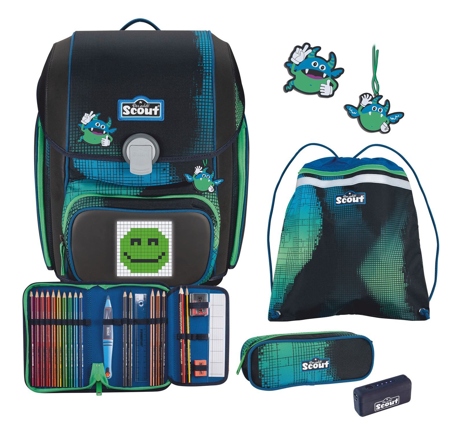 Lieferumfang | 1 Anhänger, 1 magnetischer Funny Snaps Move zum individuellen Gestalten des Schulranzens, 23-teiliges Schüleretui mit 1 Seitenklappe, befüllt mit Staedtler-Qualitätsstiften (B/T/H: ca. 12/4/20 cm), Faulenzermäppchen (B/T/H: ca. 21/8/9 cm), Li-ion Powerbank PB-2610, 2600 mAh, Schulrucksack, Turnbeutel (B/H: ca. 37/43 cm) mit separatem Nassfach und Zusatzfach; sowohl von innenbefüllbar, als auch von außen mit Reißverschluss |