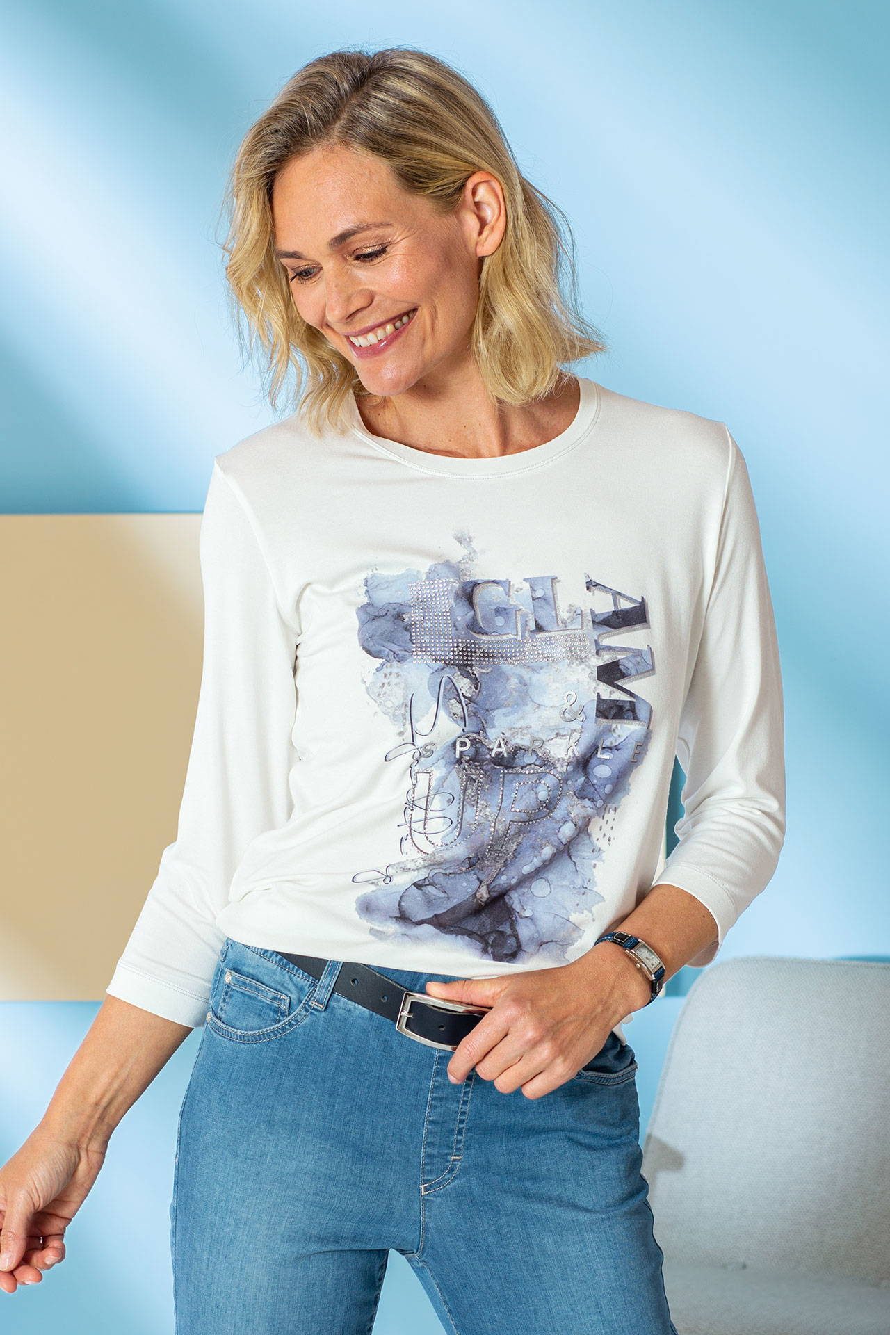 Entdecken Sie das Damen Druckshirt, das durch seinen glitzernd verzierten Frontdruck nicht nur optisch, sondern auch haptisch begeistert. Mit einem Rundhalsausschnitt und 3/4-Ärmeln vereint dieses Shirt Komfort und Stil auf perfekte Weise.