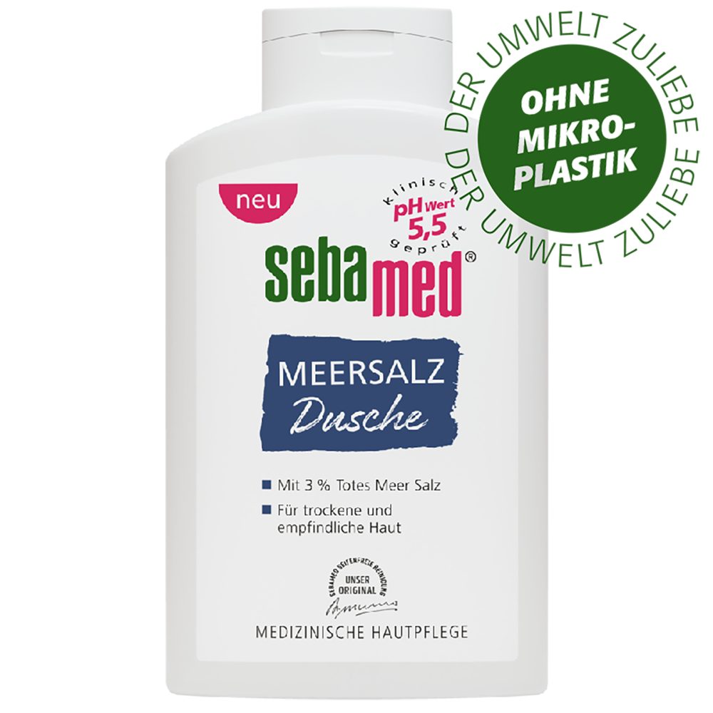 sebamed - Meersalz Dusche Körperpflege mit 3 % Totes Meer Salz Die Meersalz Dusche von sebamed enthält hochwertige Wirkstoffe wie Totes Meer Salz Mineralien, Panthenol und hauteigene Aminosäuren. Mit einem Anteil von 3 % Totes Meer Salz Mineralien wirkt die medizinische Körperpflege antibakteriell, durchblutungsfördernd und entzündungshemmend. Das Salz dringt tief in die Haut ein und entgiftet sie so von Innen. Zusätzlich wirkt es beruhigend auf chronische Hauterkrankungen wie Neurodermitis, Akne oder Schuppenflechte. Durch einen pH-Wert von 5,5 und dem Wikrstoff Panthenol wird der Hautschutzmantel stabilisiert. Die Widerstandskraft der Haut wird gegen Umwelteinflüsse gestärkt, wodurch diese dauerhaft mehr Feuchtigkeit speichern kann. Das Ergebnis: ein gesundes Frischegefühl. Die Körperpflege ist besonders hautverträglich und eignet sich gut für das tägliche Duschen. Merkmale/Komponenten Für trockene und empfindliche Haut. Enthält 3 % Totes Meer Salz Mineralien. Mit pH-Wert 5,5. Seifenfreie Reinigung. Angenehmer, frischer Duft. Dermatologisch-klinisch getestet. Frei von Mikroplastik und Mineralölen. Enthält keine Silikone. Ohne Konservierungsstoffe. Versandeinheit Duschgel: 400 ml. Inhaltsstoffe Duschgel Aqua, Cocamidopropyl Betaine, Aloe barbadensis leaf juice, Sodium C14-16 Olefin Sulfonate, Maris Sal, Capryl/Capramidopropyl Betaine, Coco-Glucoside, Parfum, Allantoin, Glycerin, Glyceryl Oleate, Sorbitol, Citric Acid, Sodium Hydroxide, Phenoxyethanol, Sodium Benzoate, Sorbic Acid, o-Cymen-5-ol