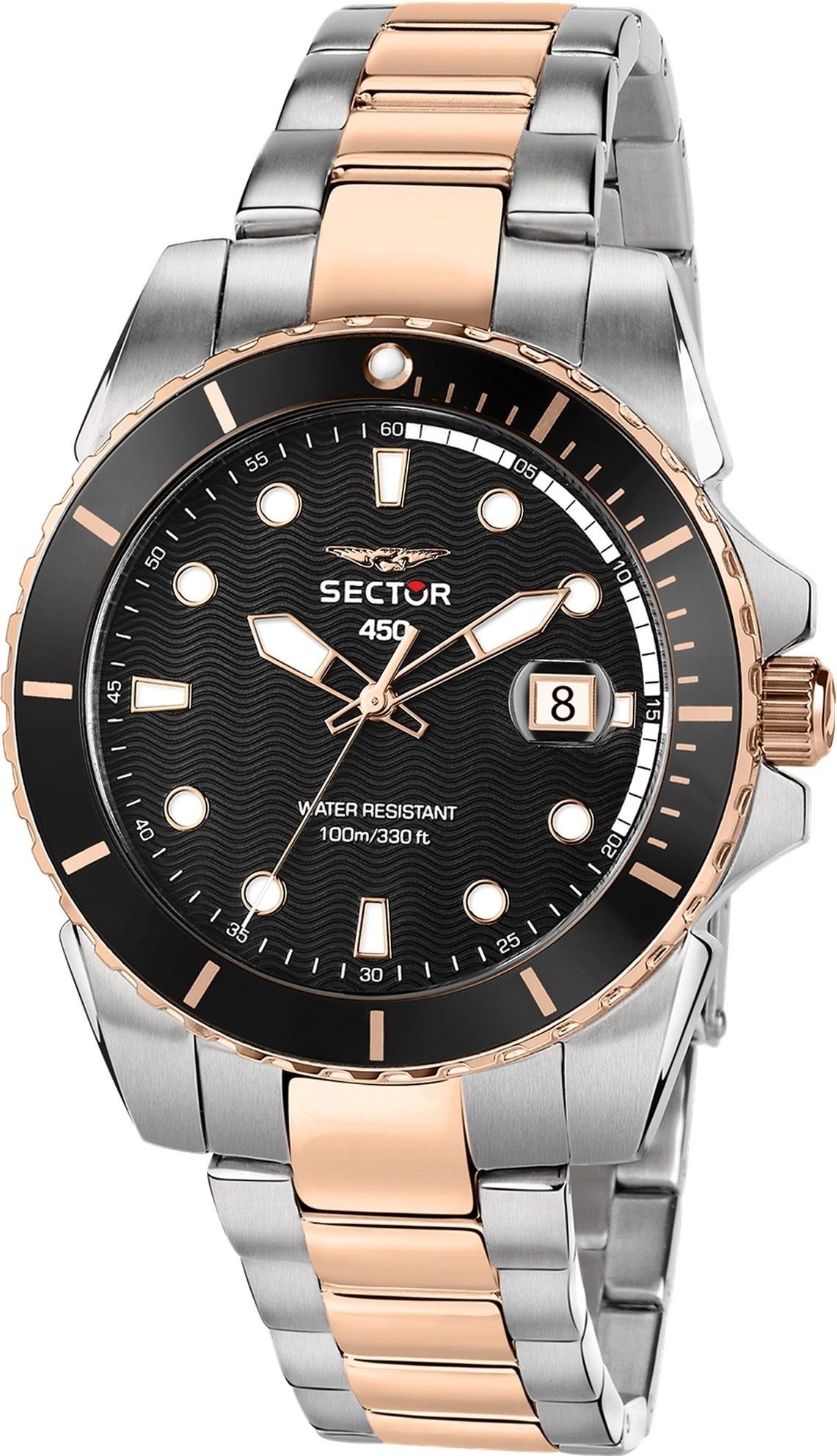 Die Fashion Uhr der Marke Sector hat ein schönes Armband aus Edelstahl in rosegold mit Sicherheits-Faltschließe. Eine Uhr aus der Sector Numbers Kollektion für Herren in der Gehäusefarbe silber rosegold mit Quarzwerk. Die Analoguhr mit Mineralglas hat ein Zifferblatt in der Farbe schwarz. Die Form der Uhr ist rund und das Gehäuse ist mittel ca. 32mm.