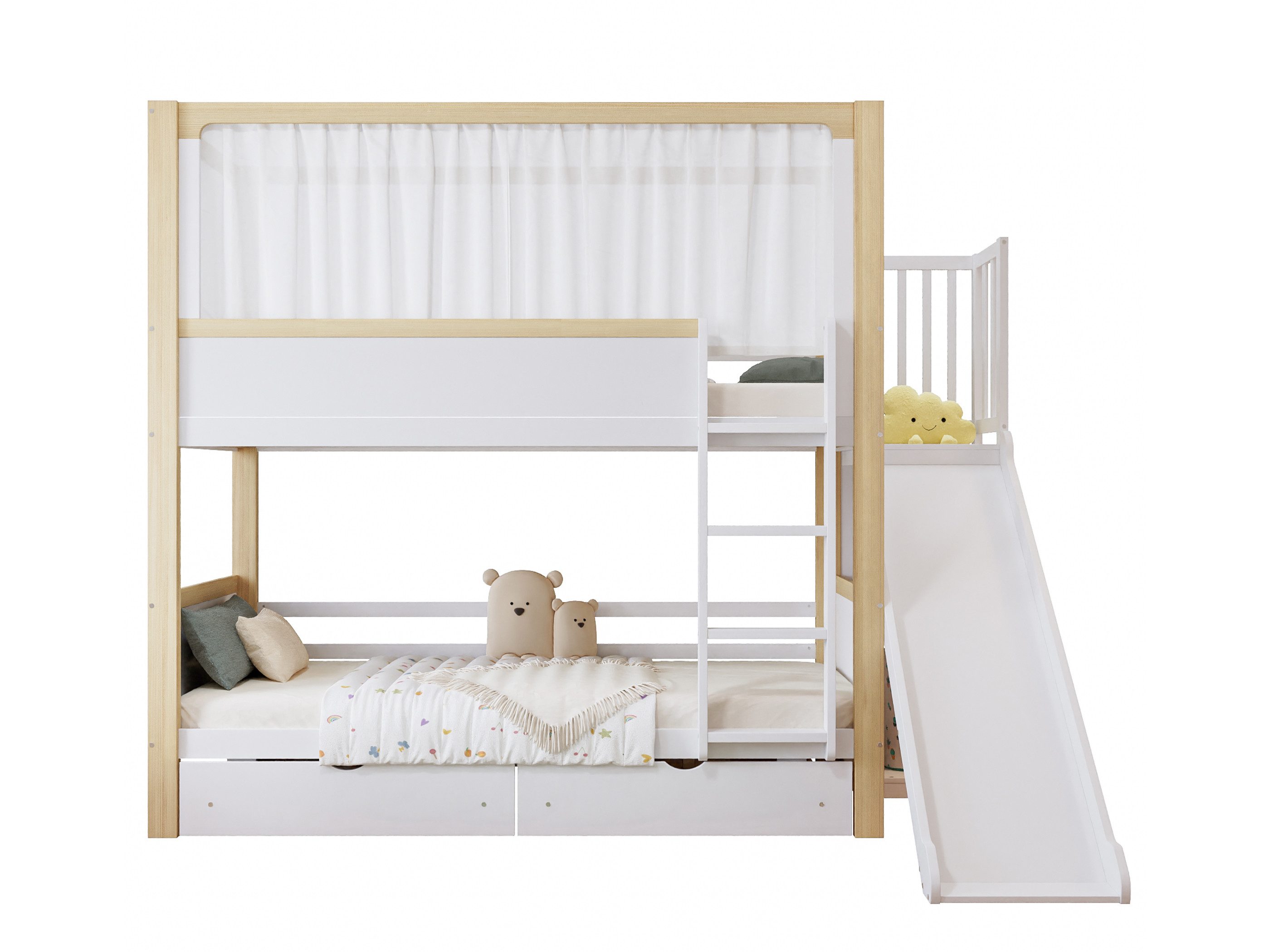 Dieses Etagenbett verbindet Funktionalität, Sicherheit und Spielspaß in einem Möbelstück. Mit zwei Liegeflächen eignet es sich perfekt für Familien mit mehreren Kindern oder für Übernachtungsgäste. Das obere Bett ist durch Schutzgeländer und ein dekoratives Himmelgestell mit Vorhang geschützt, während das untere Bett durch Kopf- und Fußbretter zusätzlichen Halt erhält. Die seitliche Rutsche bringt Abwechslung in den Alltag und wird durch praktische Ablageböden ergänzt. Eine stabile Vierstufen-Leiter erleichtert den Zugang zum oberen Schlafplatz, während zwei Schubladen auf Rollen unter dem unteren Bett wertvollen Stauraum schaffen. Ein vielseitiges Bett, das Schlafen, Spielen und Ordnung gleichermaßen ermöglicht.