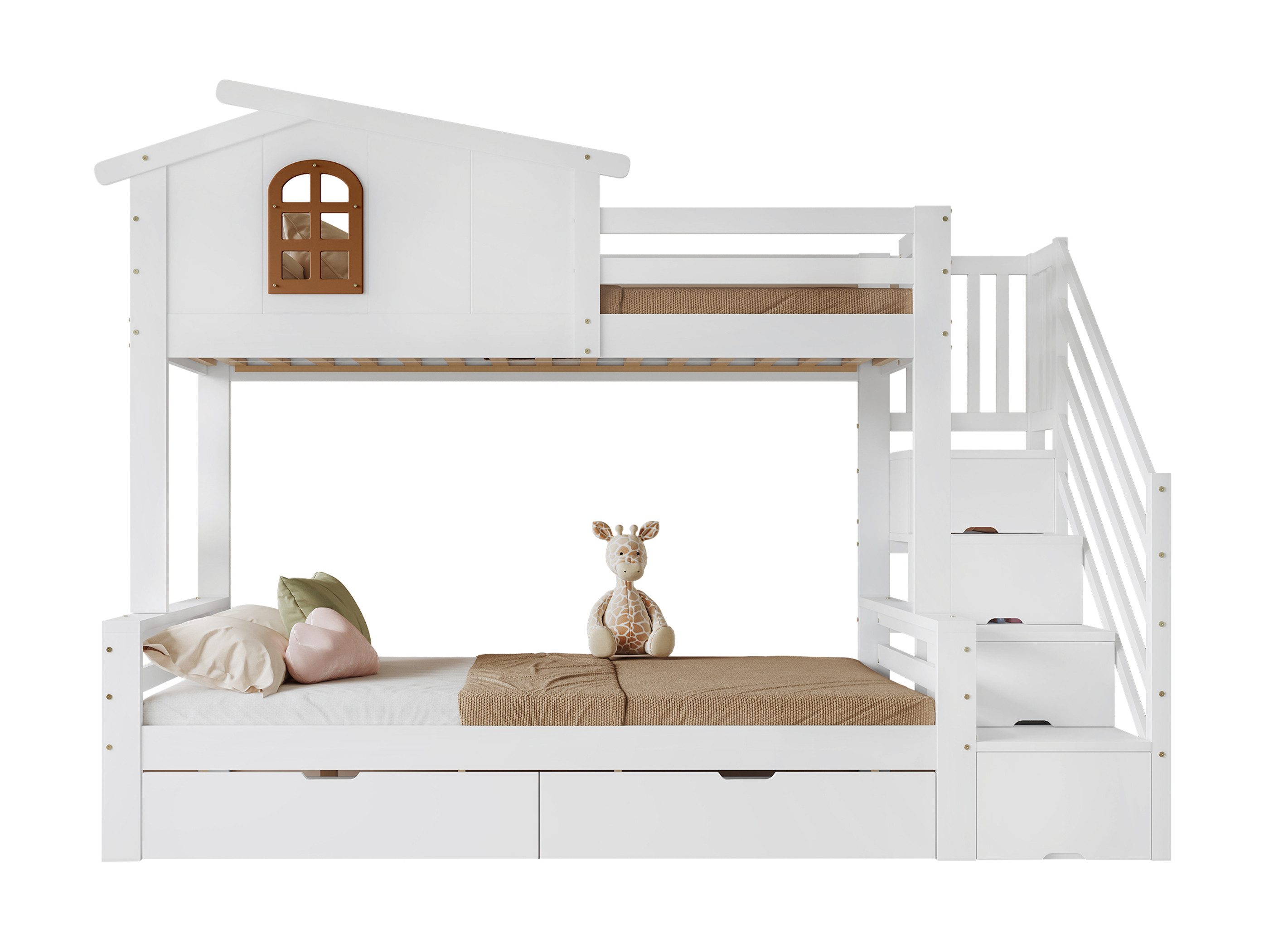 Oberbett mit Schutzgeländern: Das obere Bett ist rundum mit stabilen Schutzgeländern versehen, um Stürze zu vermeiden. Zusätzlich sorgt das dekorative Dach mit Fenster für ein verspieltes, kindgerechtes Design, das Kinderzimmer in ein kleines Abenteuerreich verwandelt.