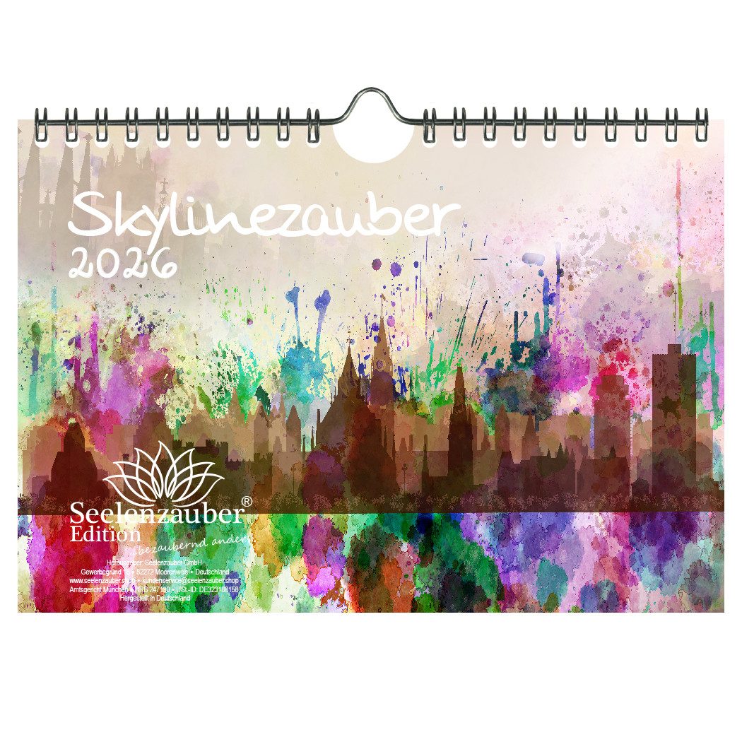 Seelenzauber Wandkalender Skylinezauber DIN A5 Kalender für 2026 Städte Skylines in Aquarell