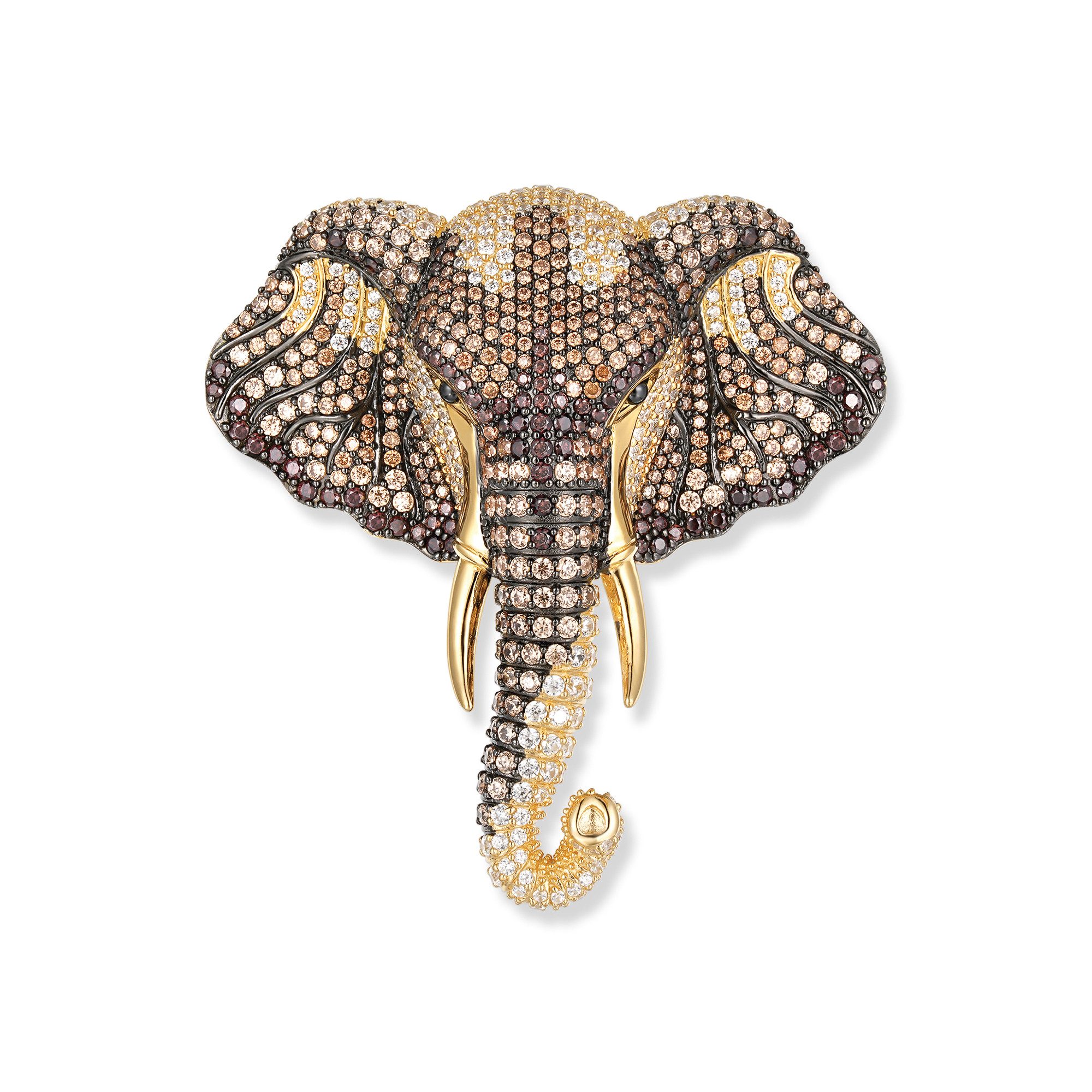 Der Raja Elefanten Anhänger und Brosche ist ein einzigartiges Schmuckstück, das die majestätische Eleganz und die wilde Anmut des Elefanten einfängt. Dieses Meisterwerk wurde aus hochwertigem 925 Sterling Silber gefertigt und kunstvoll mit 18k vergoldet, um ihm eine luxuriöse Ausstrahlung zu verleihen. Der imposante Elefantenkopf, der als zentrales Element des Anhängers und der Brosche dient, hat seinen Rüssel nach oben gebogen, um das Glück einzufangen. Dieses Detail symbolisiert nicht nur Glück, sondern auch Stärke und Erhabenheit, typisch für die majestätischen Elefanten. Die Fassung des Elefantenkopfes ist kunstvoll mit bräunlichen und champagnerfarbenen Zirkonia verziert. Diese funkelnden Steine fügen dem Schmuckstück eine luxuriöse und ausdrucksstarke Note hinzu, die den Charakter des Elefantenkopfes auf elegante Weise unterstreicht. Der Raja Elefanten Anhänger und Brosche ist nicht nur ein Schmuckstück, sondern ein kraftvolles Statement unserer Safari Kollektion. Tragen Sie dieses einzigartige Stück, um Ihre Liebe zur Natur und Ihre Verbundenheit mit der wilden Schönheit der Tierwelt zu zeigen. Es ist der perfekte Begleiter für besondere Anlässe, der Ihren Stil mit einer Note von Eleganz und Abenteuer bereichert.