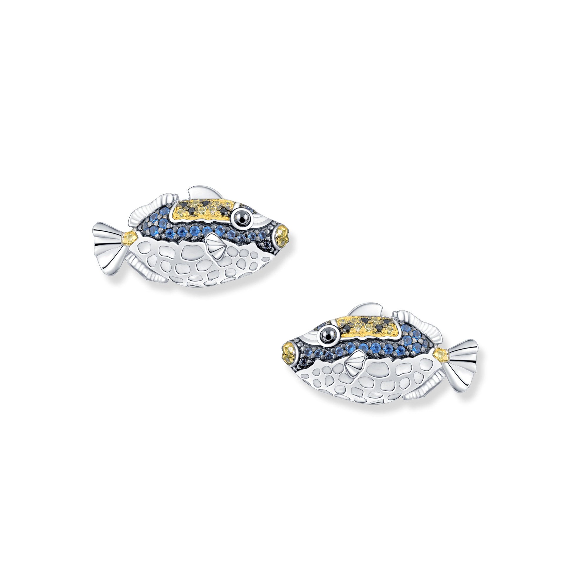Erleben Sie die Schönheit des Meeres in Form der bezaubernden Loki Fisch Ohrringe. Diese Ohrringe sind ein Kunstwerk der Handwerkskunst, das die Eleganz des Ozeans auf einzigartige Weise einfängt. Jeder Ohrring ist aus feinem 925 Sterling Silber gefertigt und mit Emaille veredelt, die in einem aufwendigen Prozess aufgetragen wird. Die Kombination aus rhodinierter Oberfläche, geschwärzten Akzenten und vergoldeten Details verleiht den Ohrringen einen edlen und mystischen Charakter. Die Zirkonia Steine in Blau und Weiß sind kunstvoll platziert und bringen die Farben des Meeres zum Funkeln.