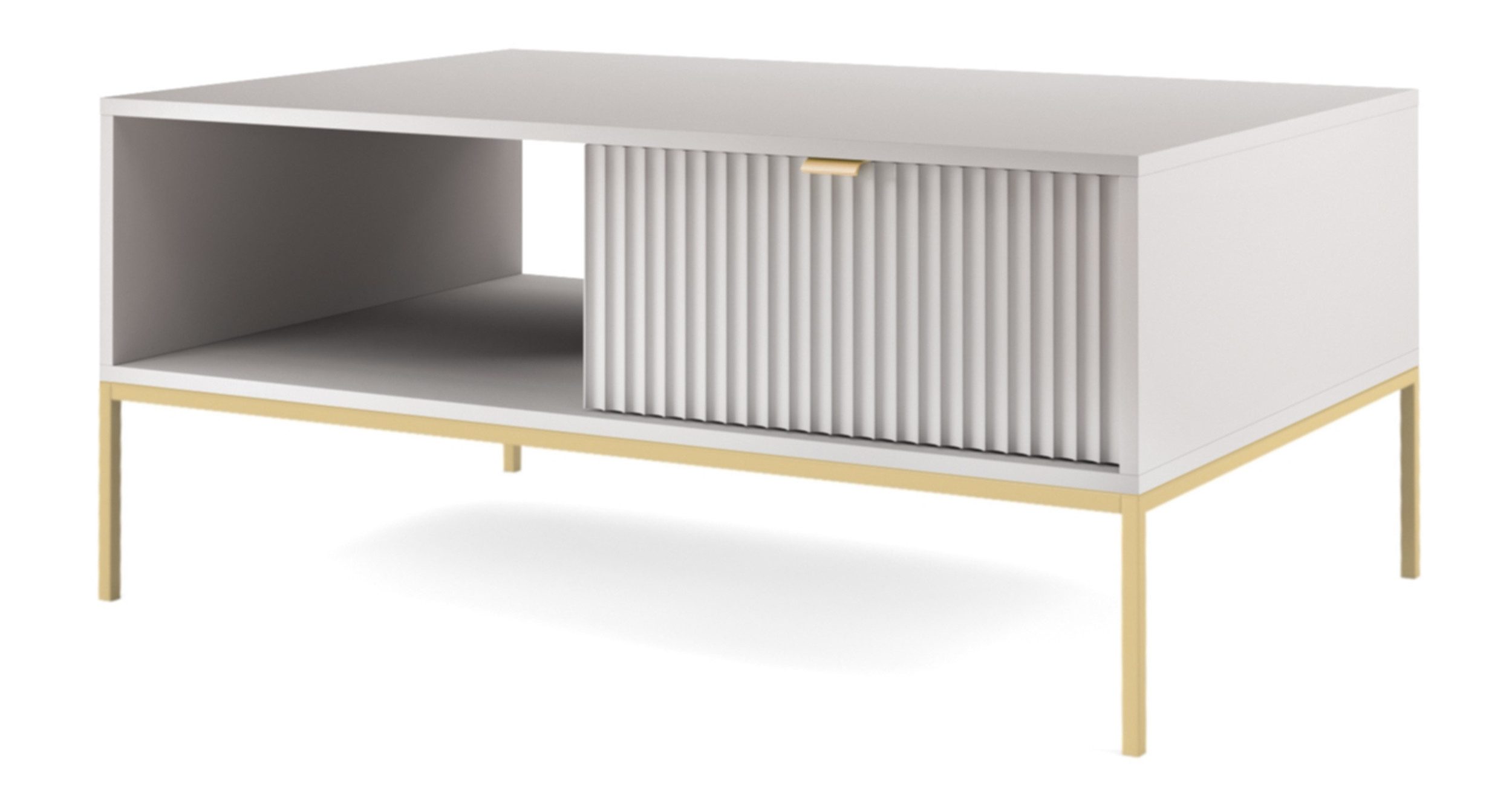 Praktische Schubladen und ein offenes Fach sorgen für Ordnung und sind ideal, um Elektronik, Snacks, Bücher oder Fernbedienungen griffbereit zu verstauen. Die rechteckige Form passt perfekt zu Sofas und Ecken, während die geriffelten Fronten dem Design eine moderne Note verleihen.