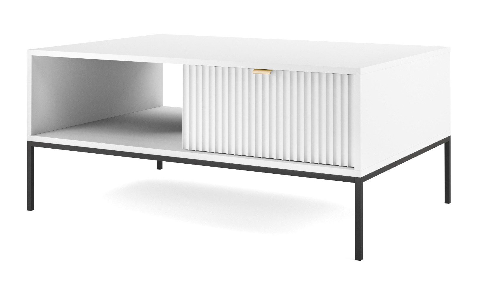 Praktische Schubladen und ein offenes Fach sorgen für Ordnung und bieten Platz für Bücher, Fernbedienungen, Snacks oder Elektronik. Die rechteckige Form passt perfekt zu Sofas oder Eckmöbeln, während die geriffelten Fronten dem Tisch eine moderne, strukturierte Optik verleihen.