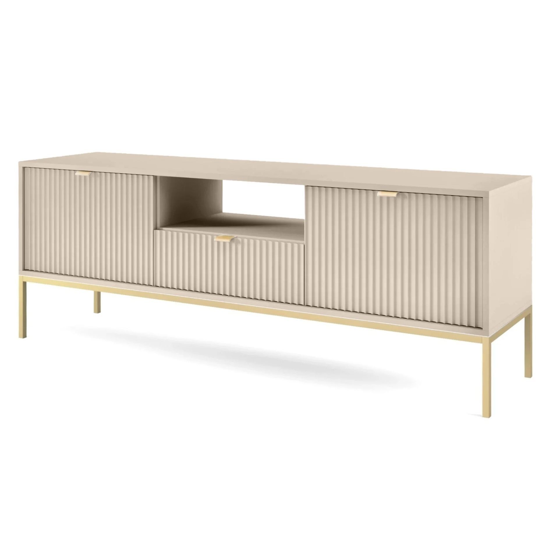 Das TV-Lowboard Vellore kombiniert modernen, minimalistischen Stil mit eleganten Details und wird so zum Highlight in jedem Wohnzimmer. Die klaren Linien und das geometrische Design des Gestells in edlem Goldton schaffen eine zeitlose Ästhetik, die perfekt zu verschiedenen Einrichtungsstilen passt. Die geriffelten Fronten verleihen dem Möbelstück Tiefe und Struktur, während die schmalen, goldenen Griffe das luxuriöse Design harmonisch abrunden.
