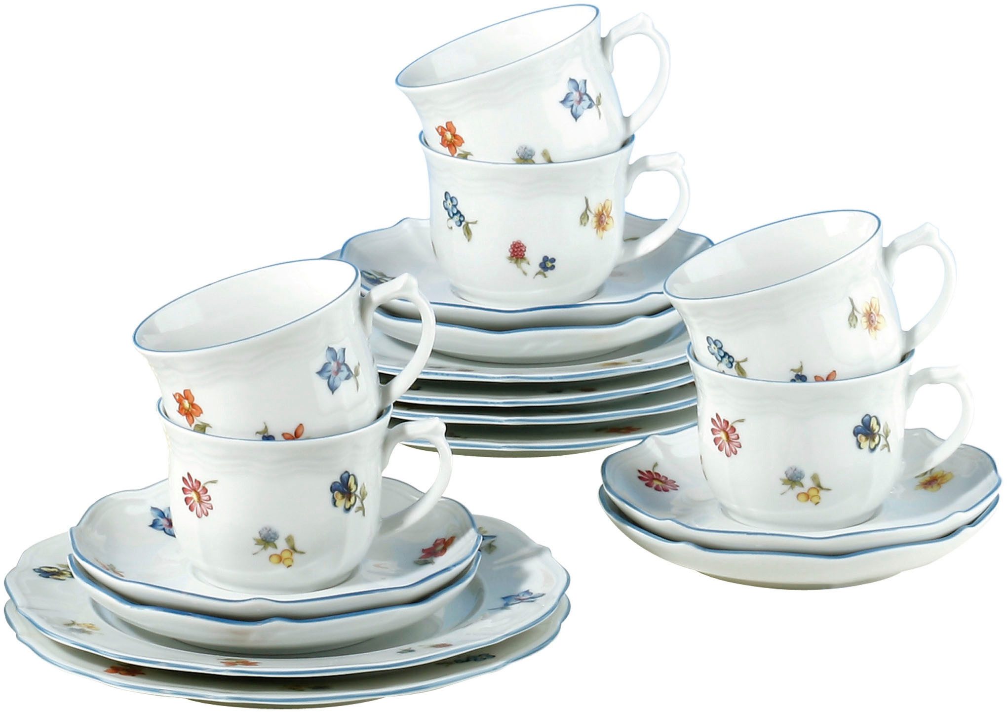 schönes, dünnes Porzellan aus dem ich sehr, sehr gern trinke. Die kleinen bunten Streublümchen auf dem Kaffeegeschirr machen den Kaffeetisch romantisch und gepflegt. Die Henkel an den Kaffeetassen sind so, dass man sie gut und sicher greifen und halten kann. Die nicht so flachen Untertassen und Teller, haben das Aussehen von altem Geschirr. Ich habe auf jedes Erbe verzichtet und freue mich um so mehr dieses gekauft zu haben. Ich werde auch noch das Essservice kaufen. Meine klare Kaufempfehlung!
