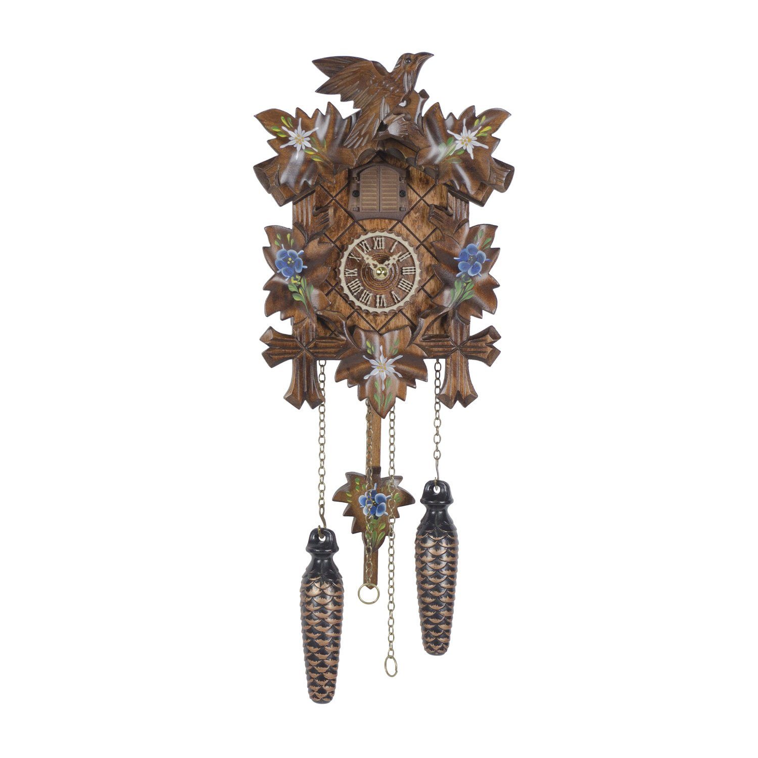 Ein gebeiztes, mit koloriertem Edelweiß / Enzian verziertes Nussbaum-Holzgehäuse, auf dem ein beeindruckender, flügelschlagender Vogel thront, ist Ausdruck jenes werthaltigen Schwarzwald-Stils, der weltweit geschätzt wird. Die Kuckucksuhr ist mit einem hochwertigen Quarzpendelwerk und 12 stündlich wechselnden Melodien ausgestattet. Zudem sorgt eine praktische automatische Nachtabschaltung dafür, dass täglich von 8 Uhr abends bis 8 Uhr morgens die Geräusche verstummen.