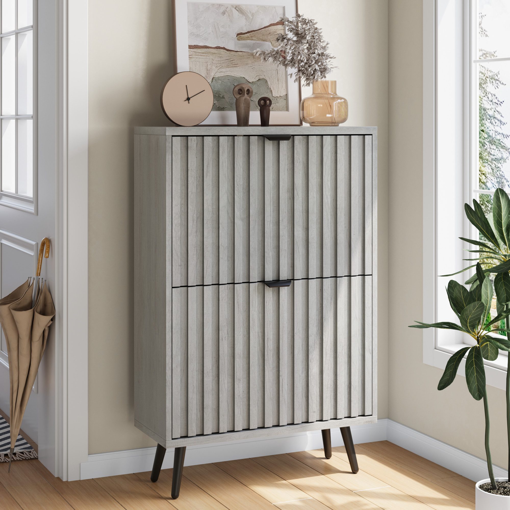 Der Schuhschrank mit Flip-Schublade ist die perfekte Lösung für jeden Eingangsbereich, Flur oder Wohnzimmer. Mit seinem platzsparenden Klappschubladendesign und den zwei Klapptüren bietet er nicht nur eine einfache Handhabung, sondern schützt Ihre Schuhe auch vor Staub. Das einzigartige Nutdesign und die Kombination aus grauem und mattem Metall verleihen ihm ein modernes und zugleich zeitloses Aussehen. Mit Platz für 6-12 Paare und verstellbaren Schubladen ist er äußerst funktional und anpassbar für verschiedene Размер обувиn. Zudem sorgt die integrierte Kippvorrichtung für zusätzliche Sicherheit, besonders in Haushalten mit Kindern. Dieser multifunktionale Schuhschrank hält Ihre Schuhe ordentlich und griffbereit, egal ob Sie ausgehen oder nach Hause kommen.