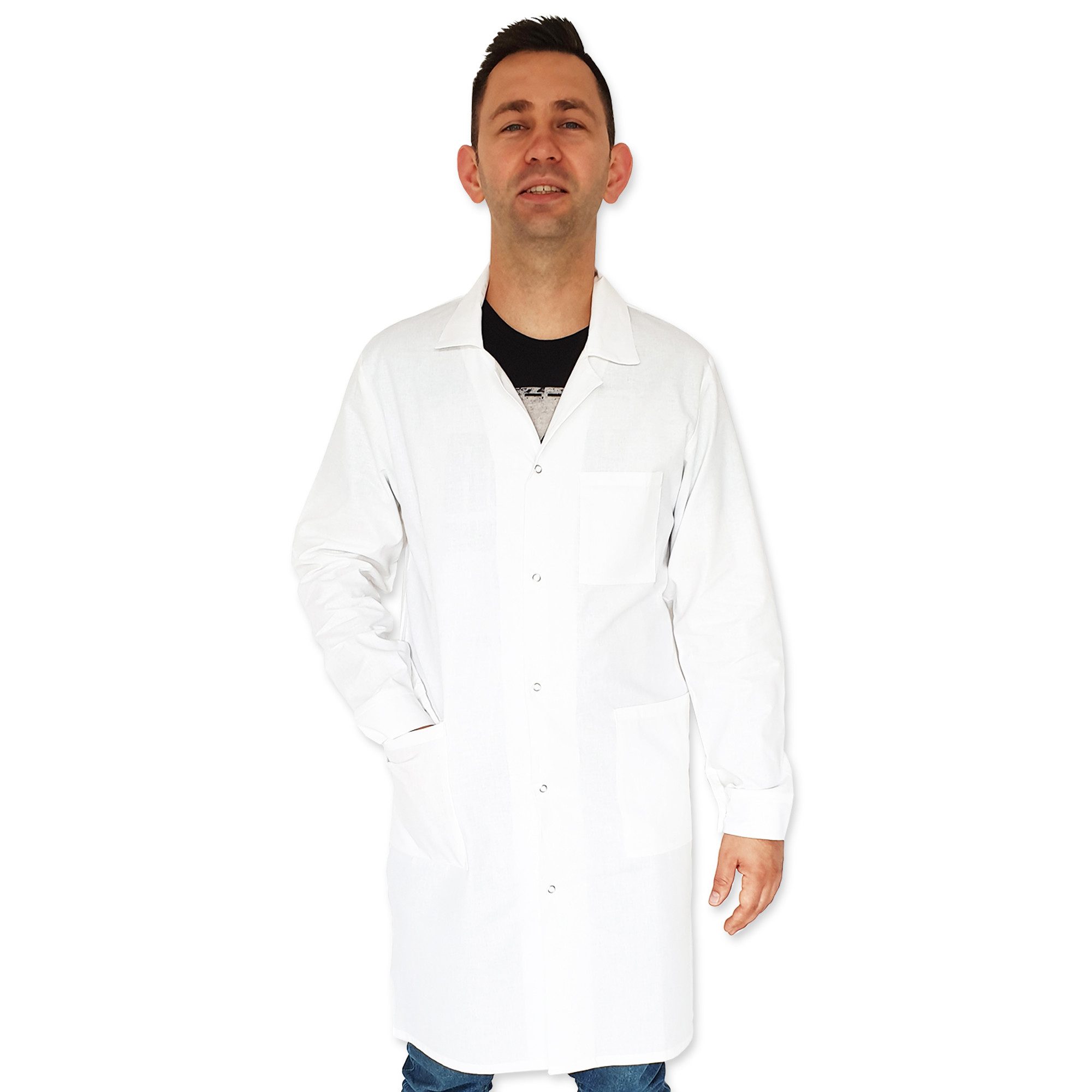 Professioneller Laborkittel in Weiß für Herren im Gesundheitswesen. Langer Schnitt bietet vollständigen Schutz.