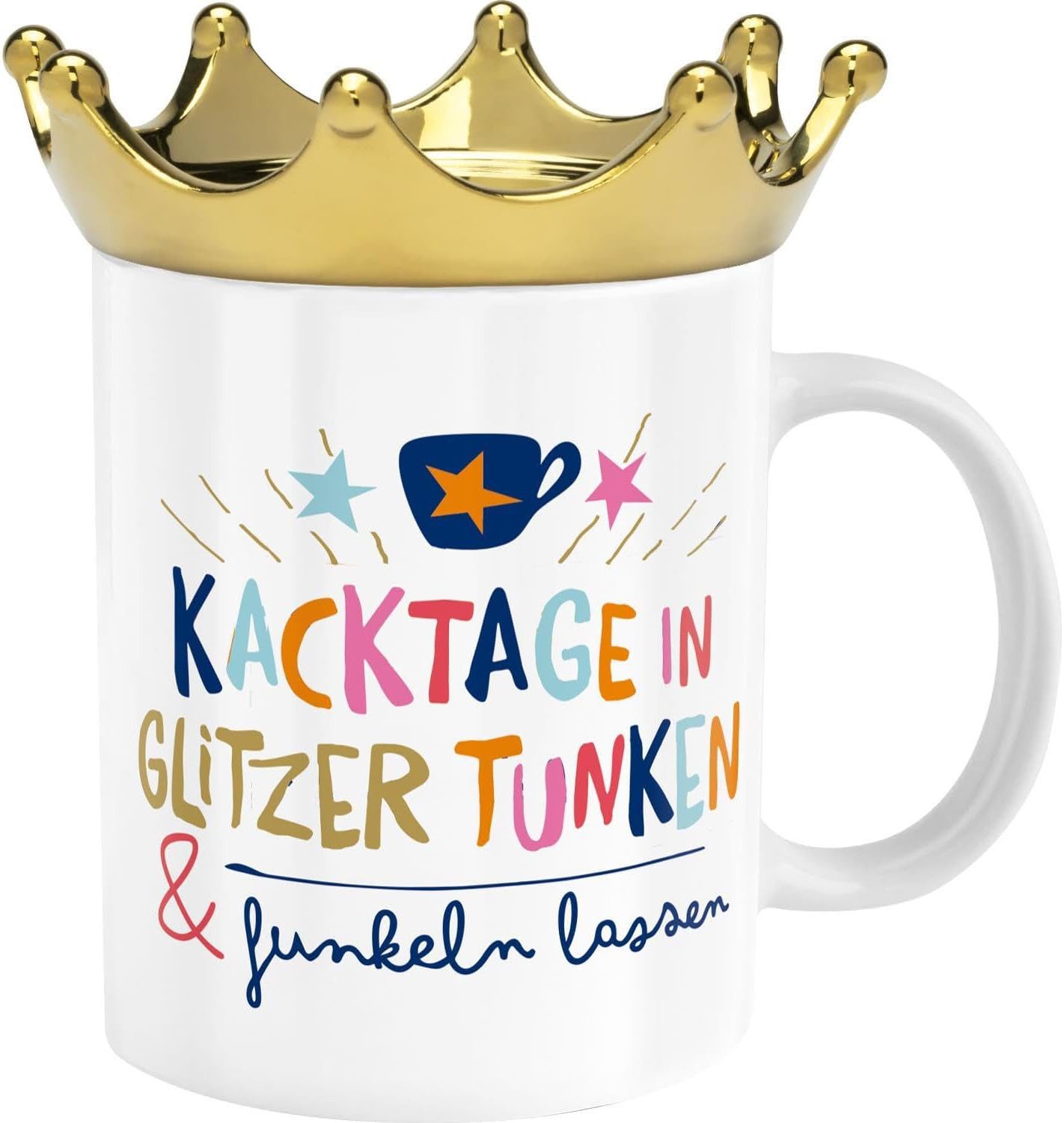 TASSE MIT SPRUCH: Tasse aus Porzellan mit farbigem Motiv in Regenbogen-Farben und passendem Spruch "…tage in Glitzer tunken und funkeln lassen", Volumen 50 cl, Höhe 12 cm, Durchmesser 9,7 cm, Kaffeetasse mit goldenem Kronendeckel, in Geschenkbox.