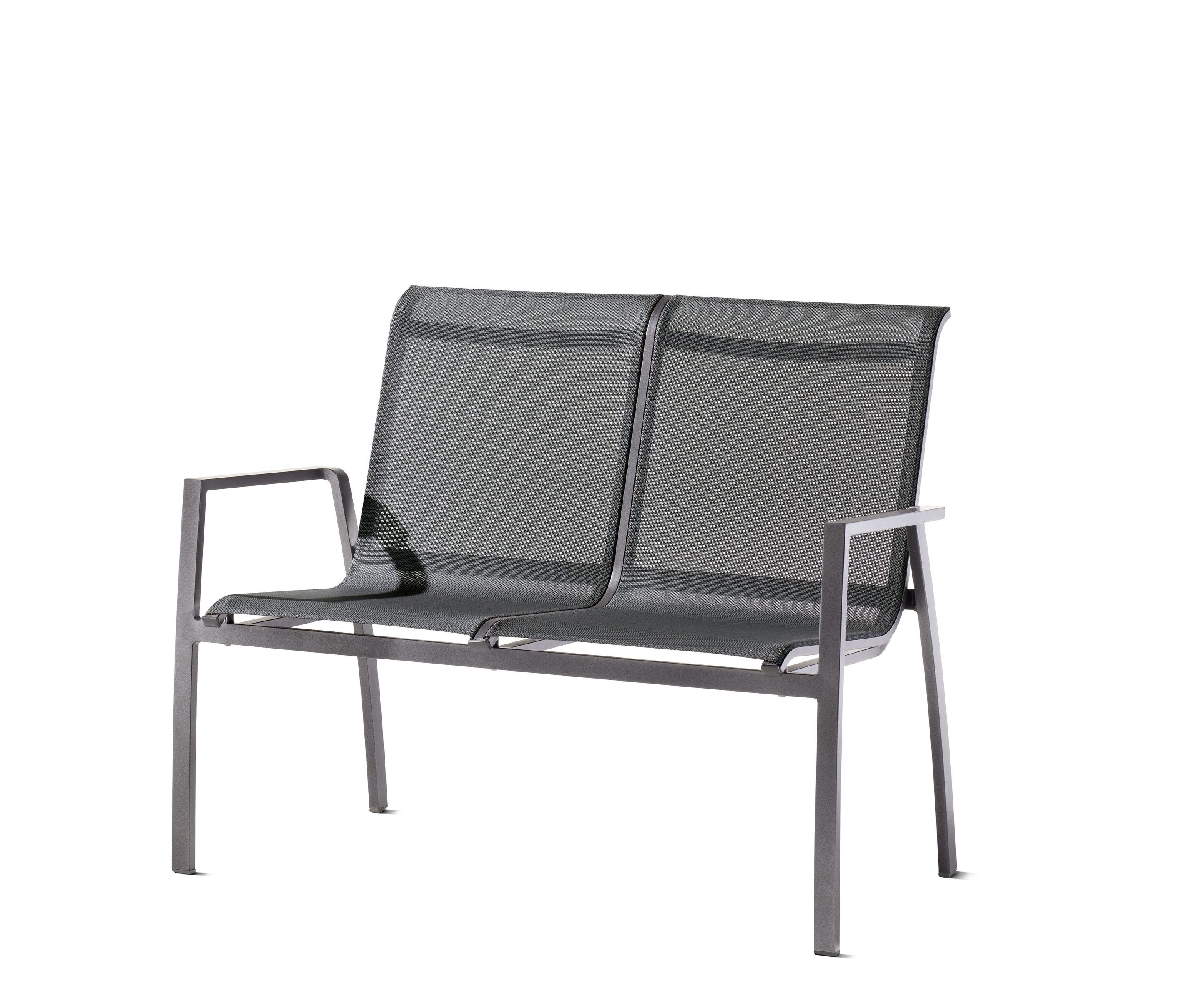 Das Gestell aus Aluminium mit Polyesterbeschichtung in Silbergrau verleiht der Bank eine moderne Optik und sorgt für eine stabile Konstruktion.