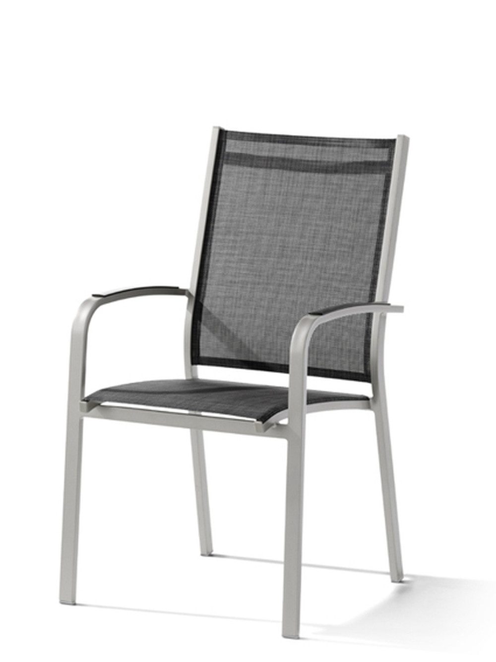 Hergestellt aus Aluminium und Kunstfasergewebe Textilux® in Grau, ist der Stuhl besonders robust und witterungsbeständig. Perfekt für den Einsatz im Freien.