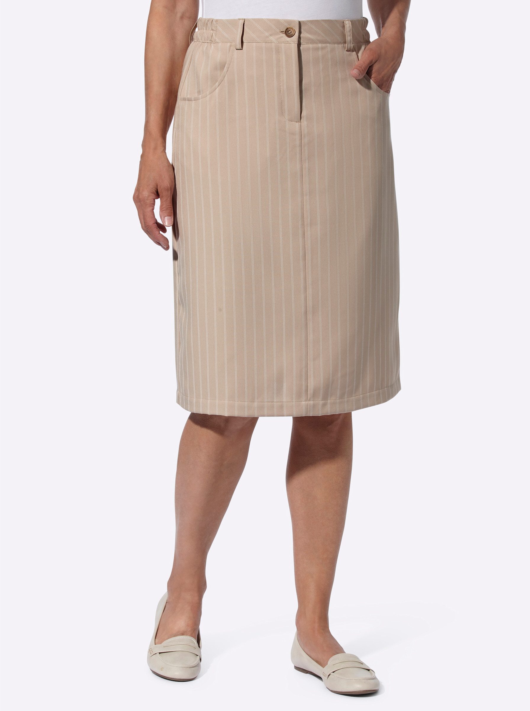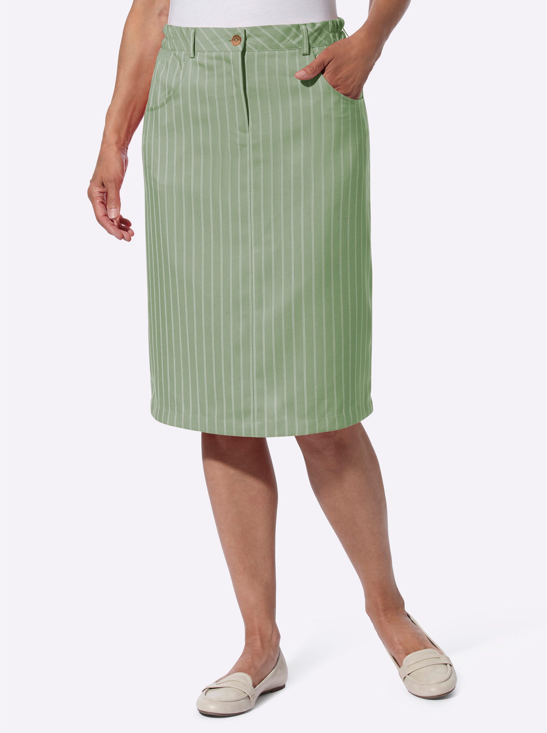 Schmal geschnittener Rock im flotten Streifen-Look. Mit seitlichem Dehnbund, Knopf- und Reißverschluss sowie Gürtelschlaufen. 2 Taschen vorne, imitierte Leistentaschen hinten. Gehschlitz hinten für mehr Bewegungsfreiheit. Ohne Gürtel.