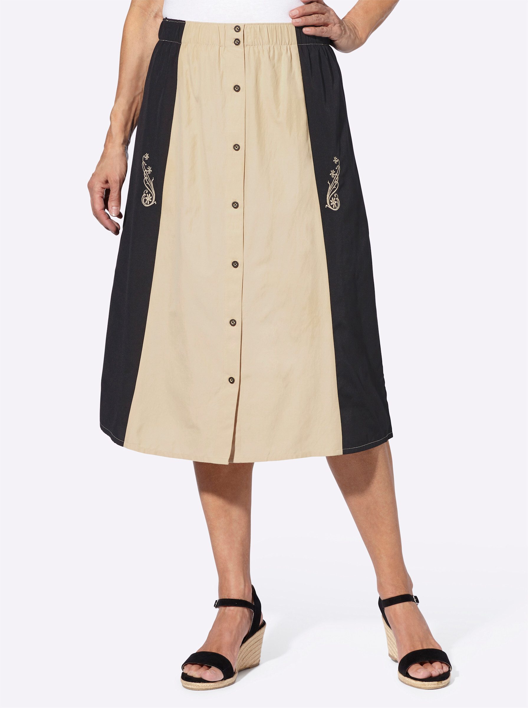 Rock in weiter Bahnenform mit hübscher Trachten-Stickerei vorne. Rundum-Dehnbund sowie durchgehende Knopfleiste mit Knöpfen in Horn-Optik.