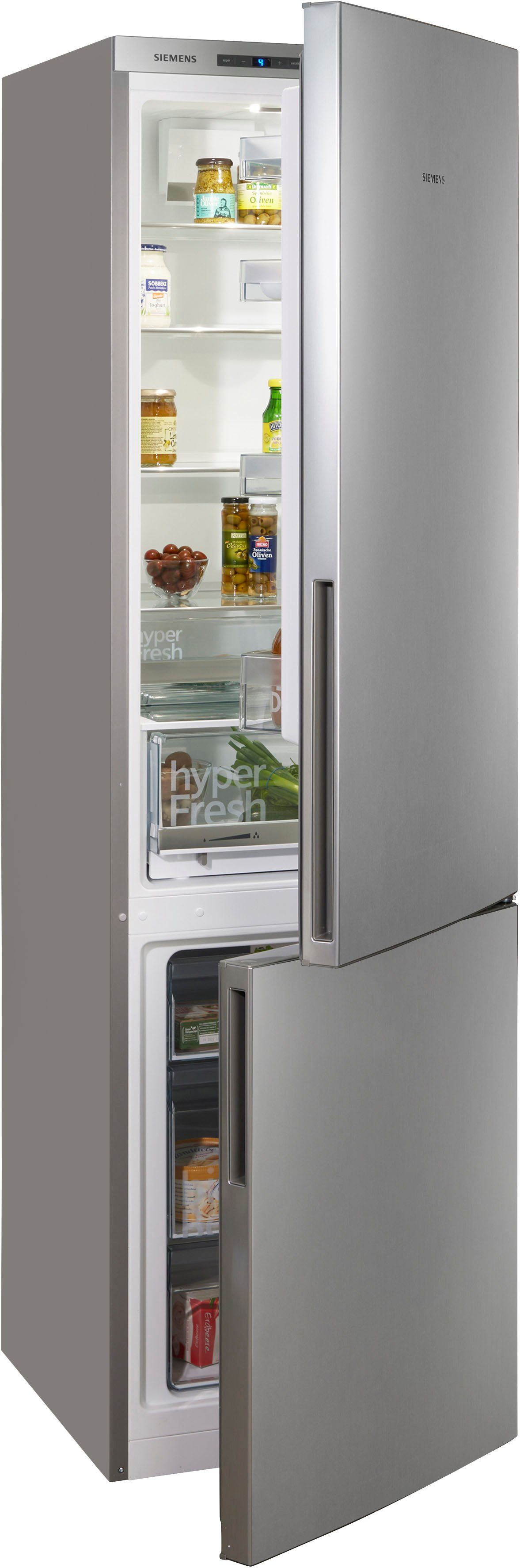 Die »KG39E4LBA« ist eine freistehende Kühl- und Gefrierkombination von SIEMENS und überzeugt mit hoher Funktionalität sowie der Energieeffizienz-Klassifizierung B (Skala Energieeffizienzklasse A bis G). Viel Platz bietet das 60 x 201 x 65 cm (B/H/T) große Modell mit seinen 94 l Gefriervolumen und 249 l Kühlvolumen. Das Modell arbeitet mit einem Betriebsgeräusch von 38 dB. Durch die LowFrost-Technologie bildet sich erheblich weniger Eis als bei herkömmlichen Geräten. Das Abtauen gelingt daher deutlich schneller und verbraucht dabei weniger Strom. Drei Gefrierschubladen und zwei Gemüseschubladen stehen zur Verfügung, um die Lebensmittel zu verstauen. Das innen installierte Display zeigt die genaue Temperatur im Gerät an. Die Kühl- und Gefrierkombination hat vier Ablageflächen aus Glas, darunter zwei höhenverstellbar, die viel Platz für Lebensmittel bieten. Schnell griffbereit sind Lebensmittel in den vier Türablagen. Die Supergefrier-Funktion sorgt dafür, dass sich die Lebensmittel besonders schnell kühlen und einfrieren lassen. Steht die Tür zu lange offen, gibt die Kühl- und Gefrierkombination ein akustisches Warnsignal. Den Überblick behält man außerdem durch die LED-Innenbeleuchtung. Für diejenigen, die auf der Suche nach einer Kühl- und Gefrierkombination sind, ist die »KG39E4LBA« von SIEMENS eine gute Wahl.
