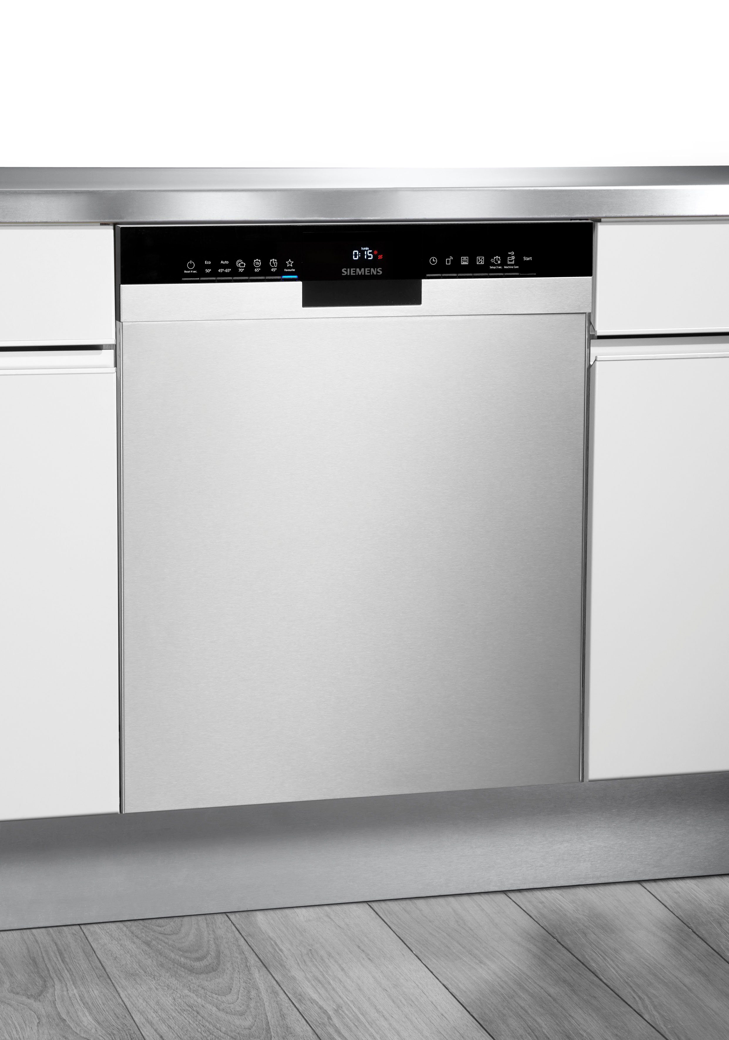 Der SN43HS11TE von SIEMENS ist ein Unterbaugeschirrspüler mit den Maßen 59,8 x 81,5-87,5 x 57,3 cm (BxHxT). Mit einer Beladekapazität von 13 Maßgedecken ist die Geschirrspülmaschine hervorragend geeignet für Haushalte ab vier Personen. Auch stark verschmutztes Ess- und Kochgeschirr reinigt die Geschirrspülmaschine durch das Intensiv 70-Programm und erreicht somit ein optimales, hygienisch reines Endergebnis. Über ein energiesparendes Schnell 45-Programm erhöht sich der Druck des einströmenden Wassers und der Spülvorgang verkürzt sich. Um einen Spülvorgang zu einem bestimmten Zeitpunkt zu starten, verfügt die Geschirrspülmaschine über eine praktische Startzeitvorwahl. Bei der Geschirrspülmaschine besteht keine Rostgefahr, dank des Kunststoffbodens. Wer nach einer praktischen, funktionalen und zuverlässigen Haushaltsunterstützung Ausschau hält, findet mit der Geschirrspülmaschine das perfekte Gerät.