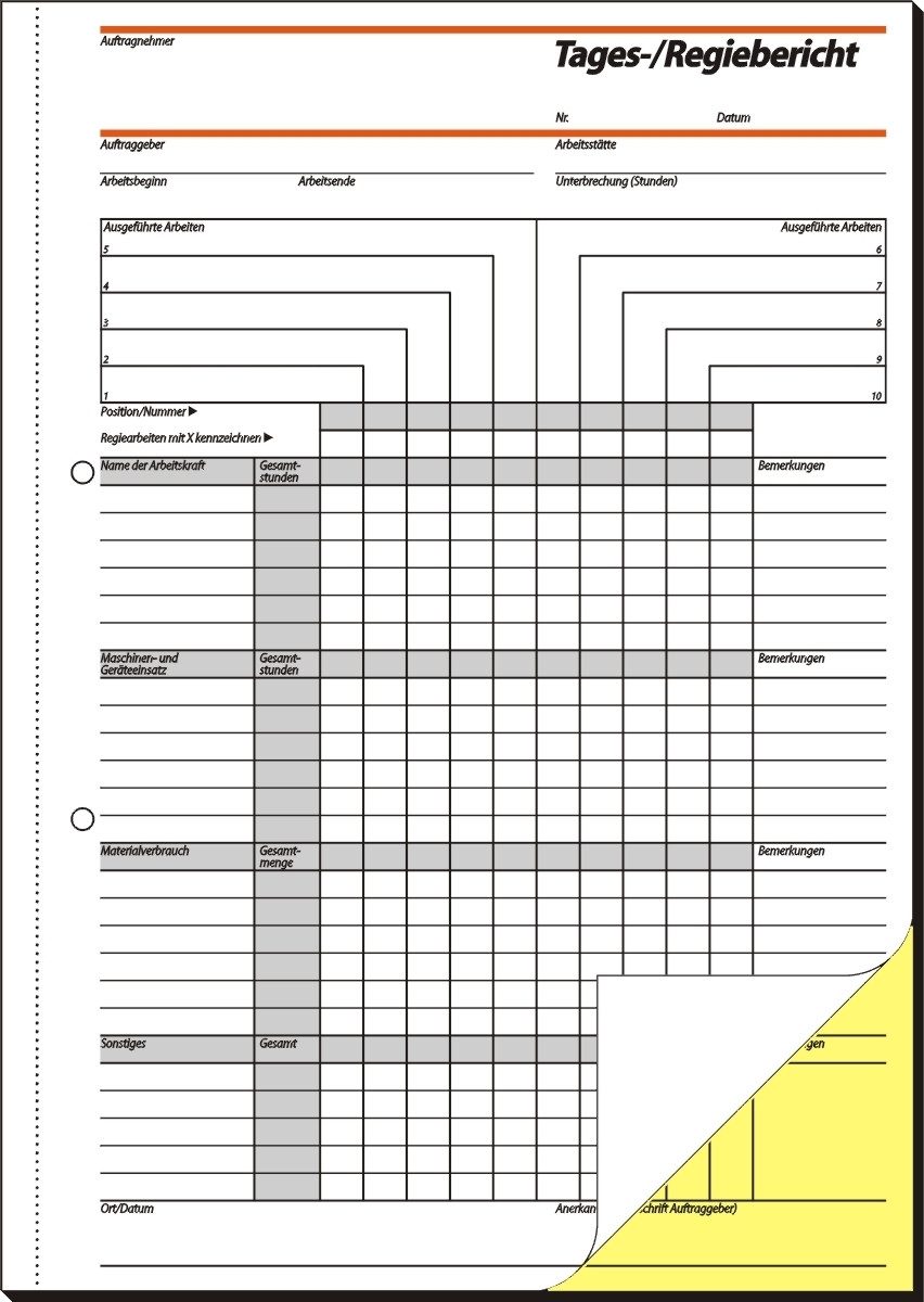 Formularblock Tages-/Regiebericht A4 hoch 56g/qm 1. und 2. Blatt bedruckt selbstdurc