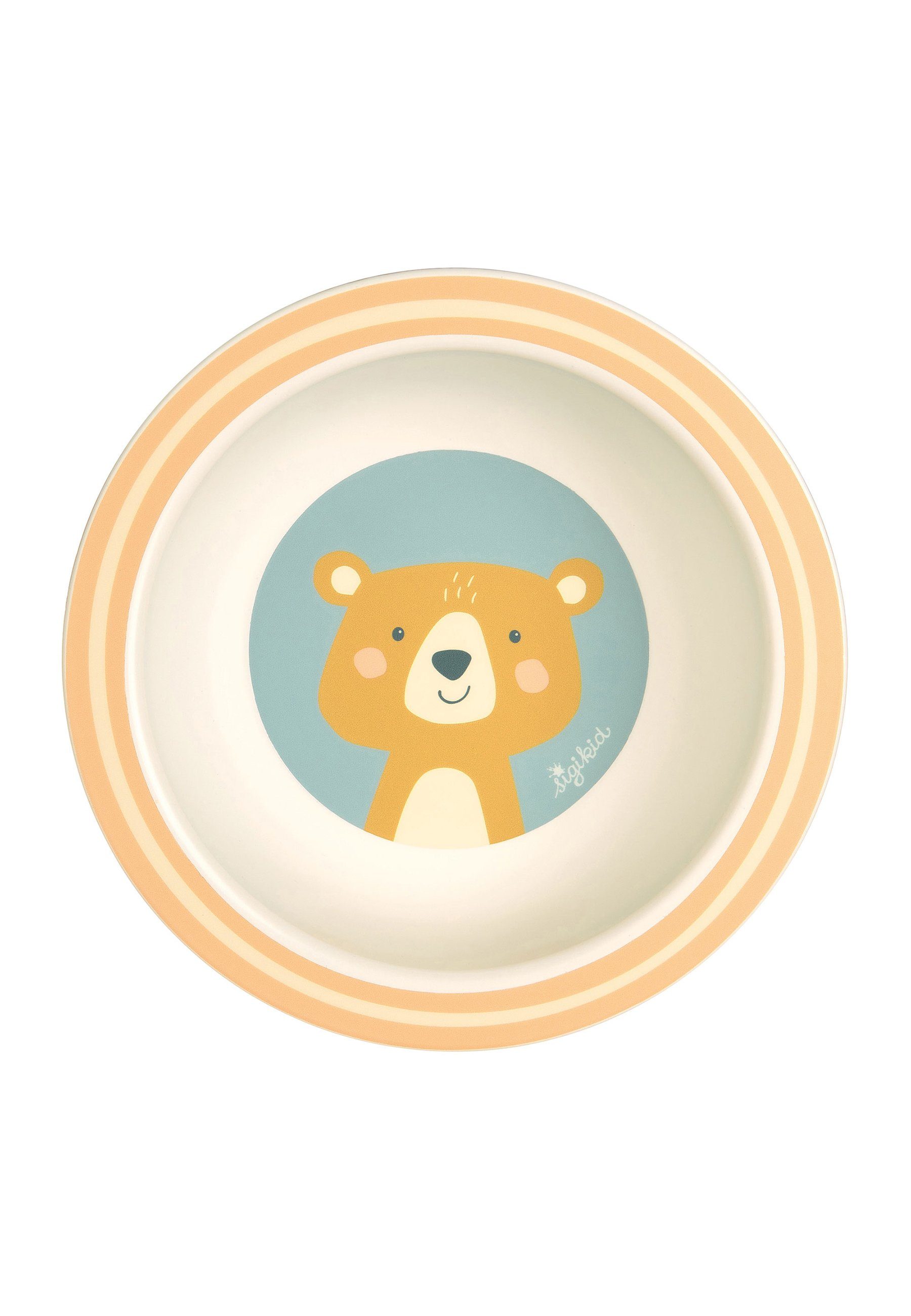 Die Schüssel mit Bär-Motiv in ansprechenden Farben Orange und Blau wird für Kinder von 2 bis 8 Jahren empfohlen. Mit einem Durchmesser von 15,5 cm ist sie gut geeignet für das Müsli am Morgen, eine Suppe am Mittag, einen Snack am Nachmittag oder den Brei am Abend. Der Gummiring am Boden des Schälchens macht das Gefäß rutschfest und sorgt somit für guten Halt auf dem Tisch – perfekt für selbständige Mahlzeiten kleiner Kinder. Zu der Geschirr-Serie „4 Freunde“ gehören ebenso Tassen, Teller und Besteck im passenden Design. Die hübsche Kinderschüssel ist praktisch, sicher und langlebig. Sie bringt Farbe auf den Tisch und sorgt für Spaß beim Essen. Sie besteht zu 100% aus rPET. Dieses Material wird direkt aus Kunststoffen/PET recycelt, welche in der Industrie bei der Produktion anfallen. So möchten wir qualitativ hochwertiges Recycling und Kreislaufwirtschaft fördern. Das Material ist sehr robust, aber nicht komplett unzerbrechlich. Die Tasse ist für die Reinigung in der Spülmaschine und für die Verwendung in der Mikrowelle geeignet – bitte hierzu unsere Gebrauchsanleitung beachten. Der Silikonring im Boden kann zur gründlichen Reinigung entnommen werden. Das Geschirr ist selbstverständlich frei von Weichmachern und nach dem Lebensmittel- und Bedarfsgegenständegesetz (kurz: LFGB) und nach DIN EN 14350 geprüft. sigikid legt besonderen Wert auf ausgesuchte Materialien und durchdachtes Design. Um die Sicherheit unserer Produkte zu gewährleisten, werden von akkreditierten Prüfinstituten regelmäßig Prüfungen gemäß dem aktuell geltenden (europäischen) Recht durchgeführt. Die Marke sigikid steht für kindgerechte Produkte, die Emotionen wecken und Eltern und Kindern gleichermaßen ein gutes Gefühl vermitteln. Seit über 55 Jahren folgt sigikid einem klaren Leitsatz: FIRST CLASS FOR KIDS! Wir machen die Welt von Familien von Anfang an kuscheliger und bunter.