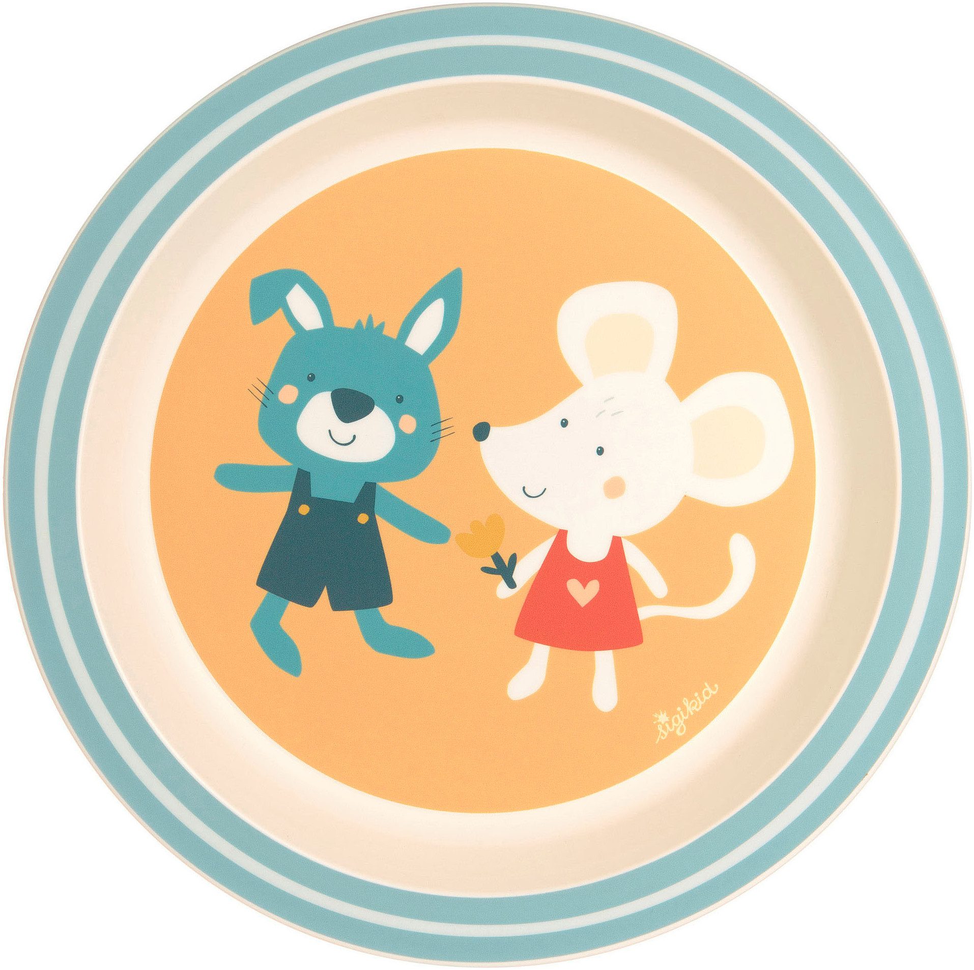 Der goldgelbe Teller mit blauem Rand und süßem Tierfreunde-Motiv - Hase & Maus - ist besonders für Kinder von 2 bis 8 Jahren geeignet. Der hübsche Kinderteller ist praktisch, sicher und langlebig. Er hat einem Durchmesser von 21,5 cm. Der Silikonring am Boden des Tellers macht das Geschirr rutschfest und sorgt somit für guten Halt auf dem Tisch. Der abgeschrägte Rand hilft, dass beim ersten selbständigen Essen nicht allzu viel vom Teller rutscht - so werden die Mahlzeiten zum Kinderspiel. Zu der Geschirr-Serie „4 Freunde“ gehören ebenso Schüsseln, Tassen und Besteck im passenden Design. Der Teller besteht zu 100% aus rPET. Dieses Material wird direkt aus Kunststoffen/PET recycelt, welche in der Industrie bei der Produktion anfallen. So möchten wir qualitativ hochwertiges Recycling und Kreislaufwirtschaft fördern. Das Material ist sehr robust, aber nicht komplett unzerbrechlich. Der Teller ist für die Reinigung in der Spülmaschine und für die Verwendung in der Mikrowelle geeignet – bitte hierzu unsere Gebrauchsanleitung beachten. sigikid legt besonderen Wert auf ausgesuchte Materialien und durchdachtes Design. Der Silikonring im Boden kann zur gründlichen Reinigung entnommen werden. Das Geschirr ist selbstverständlich frei von Weichmachern. Um die Sicherheit unserer Produkte zu gewährleisten, werden von akkreditierten Prüfinstituten regelmäßig Prüfungen gemäß dem aktuell geltenden (europäischen) Recht durchgeführt. Die Marke sigikid steht für kindgerechte Produkte, die Emotionen wecken und Eltern und Kindern gleichermaßen ein gutes Gefühl vermitteln. Seit über 50 Jahren folgt sigikid einem klaren Leitsatz: FIRST CLASS FOR KIDS! Wir machen die Welt von Familien von Anfang an kuscheliger und bunter.