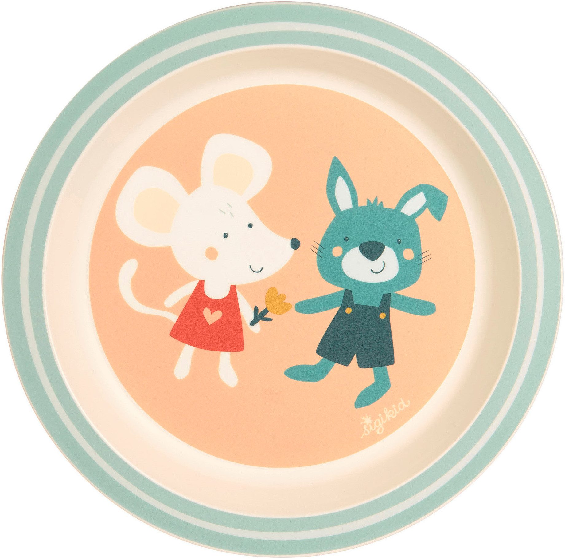Der hellorangefarbene Teller mit mintgrünem Rand und süßem Tierfreunde-Motiv - Maus & Hase - ist besonders für Kinder von 2 bis 8 Jahren geeignet. Der hübsche Kinderteller ist praktisch, sicher und langlebig. Er hat einem Durchmesser von 21,5 cm. Der Silikonring am Boden des Tellers macht das Geschirr rutschfest und sorgt somit für guten Halt auf dem Tisch. Der abgeschrägte Rand hilft, dass beim ersten selbständigen Essen nicht allzu viel vom Teller rutscht - so werden die Mahlzeiten zum Kinderspiel. Zu der Geschirr-Serie „4 Freunde“ gehören ebenso Schüsseln, Tassen und Besteck im passenden Design. Der Teller besteht zu 100% aus rPET. Dieses Material wird direkt aus Kunststoffen/PET recycelt, welche in der Industrie bei der Produktion anfallen. So möchten wir qualitativ hochwertiges Recycling und Kreislaufwirtschaft fördern. Das Material ist sehr robust, aber nicht komplett unzerbrechlich. Der Teller ist für die Reinigung in der Spülmaschine und für die Verwendung in der Mikrowelle geeignet – bitte hierzu unsere Gebrauchsanleitung beachten. sigikid legt besonderen Wert auf ausgesuchte Materialien und durchdachtes Design. Der Silikonring im Boden kann zur gründlichen Reinigung entnommen werden. Das Geschirr ist selbstverständlich frei von Weichmachern. Um die Sicherheit unserer Produkte zu gewährleisten, werden von akkreditierten Prüfinstituten regelmäßig Prüfungen gemäß dem aktuell geltenden (europäischen) Recht durchgeführt. Die Marke sigikid steht für kindgerechte Produkte, die Emotionen wecken und Eltern und Kindern gleichermaßen ein gutes Gefühl vermitteln. Seit über 50 Jahren folgt sigikid einem klaren Leitsatz: FIRST CLASS FOR KIDS! Wir machen die Welt von Familien von Anfang an kuscheliger und bunter.