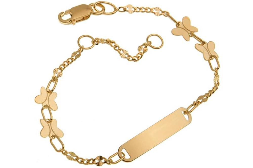 Wunderschönes, filigranes Baby- / Kinder-Armband mit Gravurplatte aus echt 375 Gelbgold. Das Gravurplättchen hat die Размер von 20x4mm. In das Armband, rechts und links von der Gravurplatte eingearbeitet, sind 4 kleine Schmetterlinge, zwischen den Kettengliedern sind kleine Schleifen. Durch eine Zwischenöse 2cm vor dem Verschluss ist das Armband verkürzbar. Ein passender Karabinerverschluss ergänzt das zarte Armbändchen.