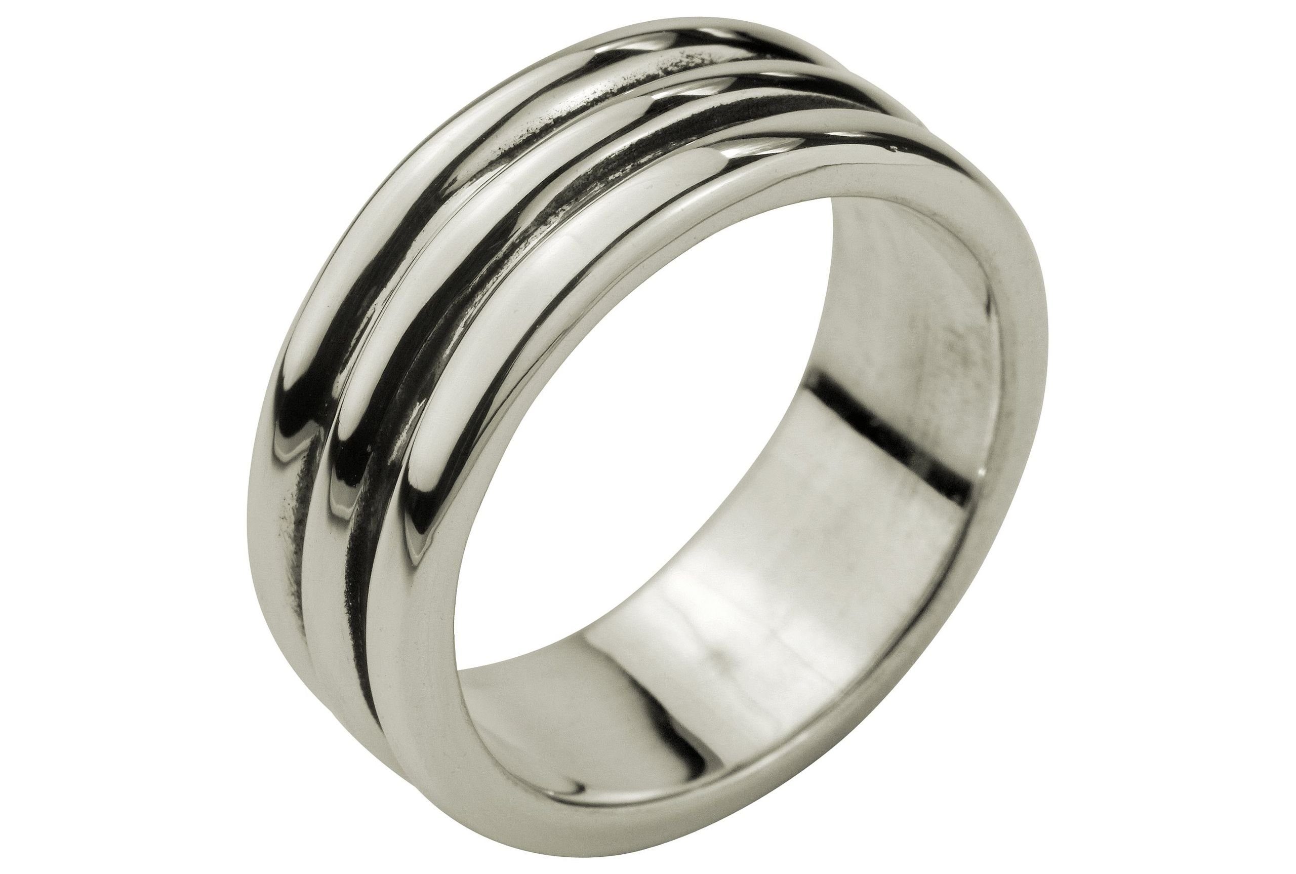 Stilbewusste Männer zeigen mit diesem coolen Herrenring in Streifen-Optik, dass sie ein Gespür für Mode besitzen. Das zehn Millimeter breite Schmuckstück aus edlem 925er Sterlingsilber schmiegt sich elegant an den Finger und begeistert mit seinem klaren und schnörkellosen Design. Die glänzende Oberfläche des Rings wird von zwei schmalen Rillen durchbrochen, die parallel zueinander verlaufen. Sie sind geschwärzt, wodurch sie stark mit der hell glänzenden Silberoberfläche des Schmuckstücks kontrastieren. Das geradlinige Streifen-Design wirkt aussagekräftig, weshalb der modische Ring einen attraktiven Akzent zu legeren und seriösen Outfits setzt. Kombinieren Sie ihn am besten mit der Herrenarmspange von SILBERMOOS im gleichen Design.