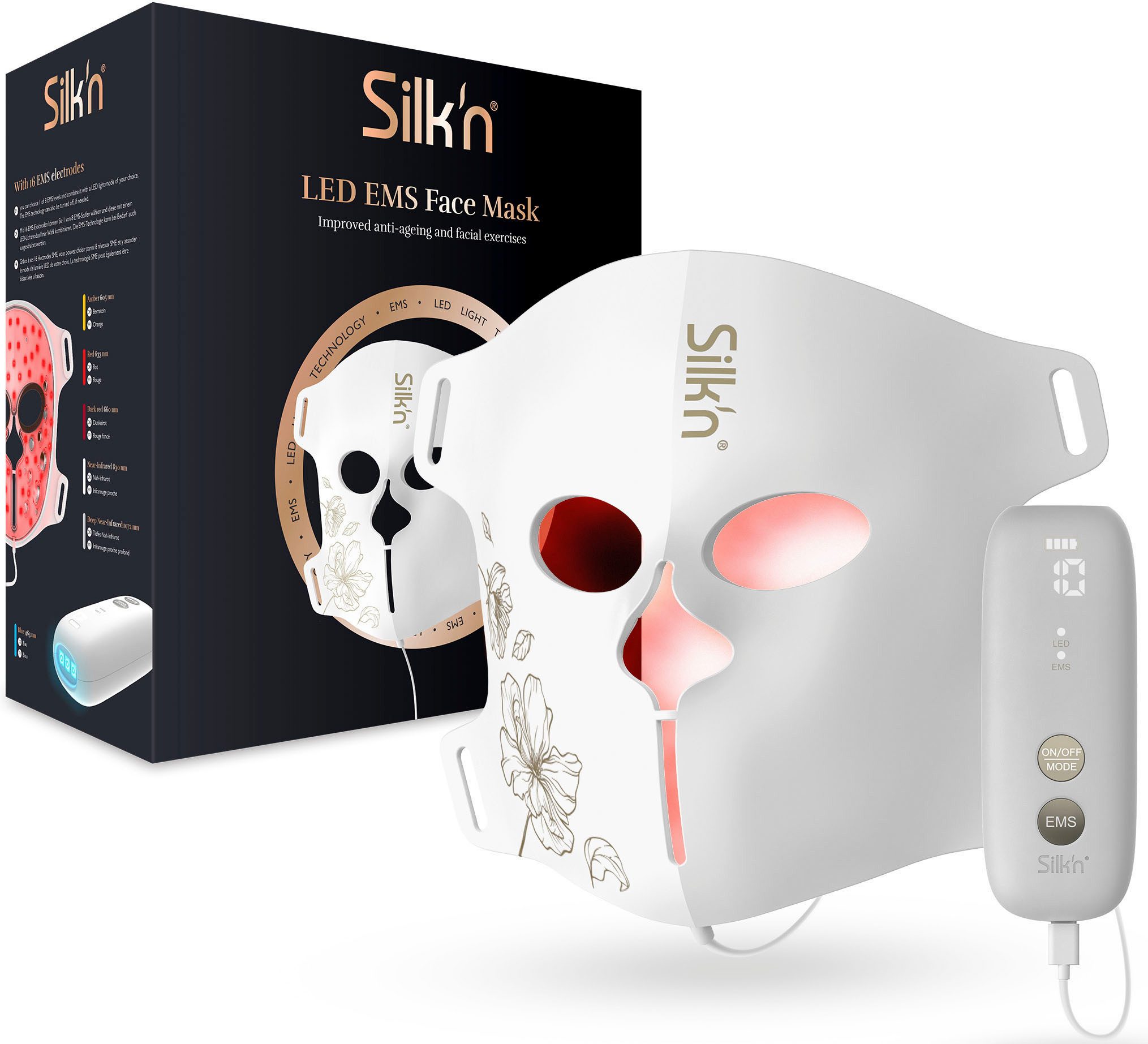 Die Silk'n LED EMS-Gesichtsmaske ist das ultimative Anti-Aging-Tool, das verschiedene LED-Lichtfarben, Nah-Infrarot- und Tiefen-Nah-Infrarot-Technologie, aber vor allem die EMS-Technologie (elektrische Muskelstimulation) enthält. Diese Maske bekämpft nicht nur die Herausforderungen der Haut wie Alterserscheinungen, aknebedingte Rötungen, Pigmentierung oder trockene Haut, sondern verbessert auch die Elastizität und trainiert die Muskeln für ein jüngeres Aussehen und einen Lifting-Effekt.