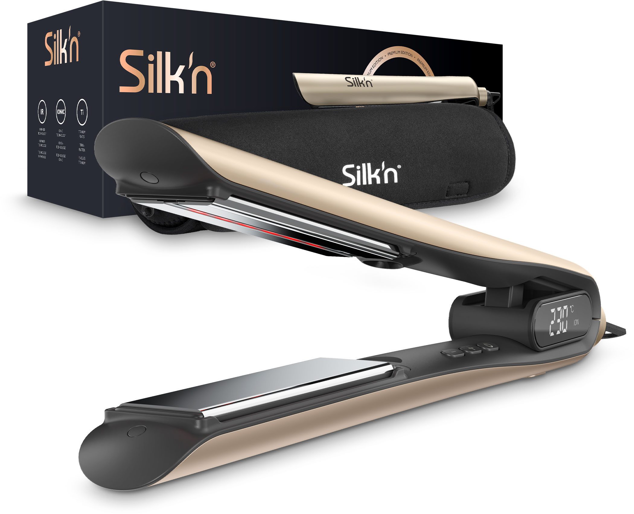 Ausstattung | Cool-Touch-Gehäuse Displayführung Ein/Aus-Schalter Hitzeschutzsensor Infrarot-Keramikheizelement Ionen-Generator Transportverriegelung |