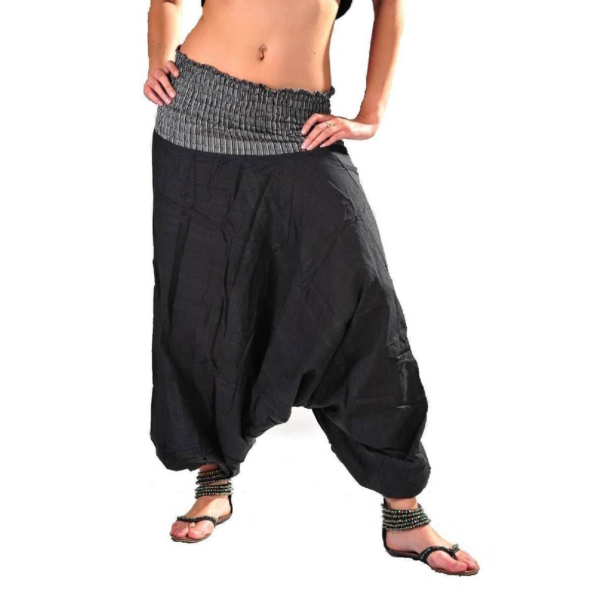 Sogar als Hosenkleid lässt sich diese Haremshose sehr gut tragen, dank des breiten, gesmokten Taillenbundes, der dann ganz einfach zum Oberteil wird.