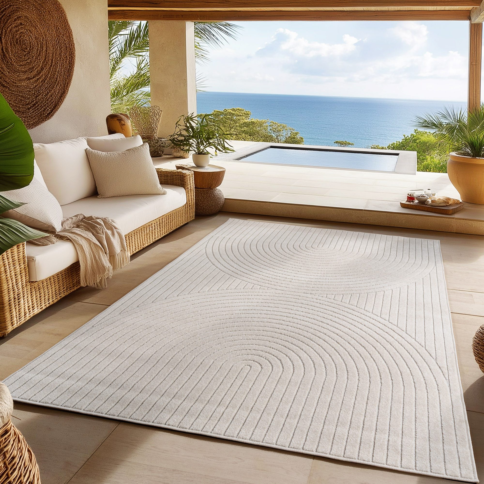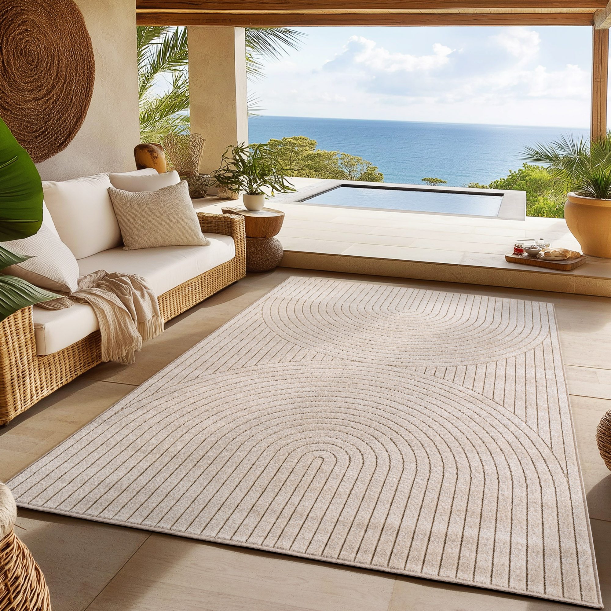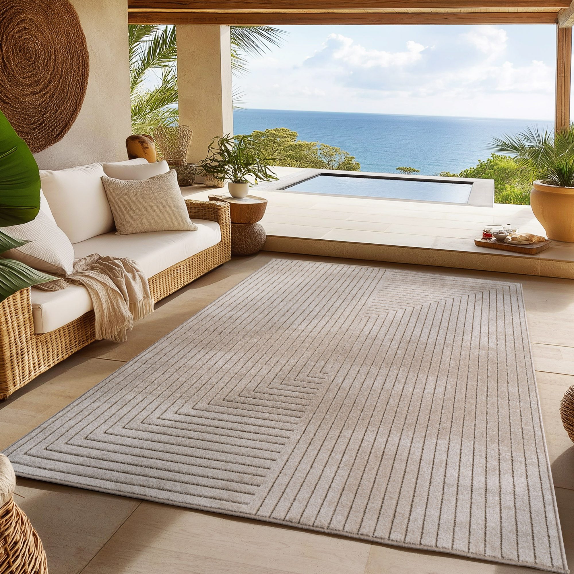 Hinweis Material | Der Indoor-Outdoor Teppich besteht aus hochwertigem, wetterbeständigem Polypropylen, was ihn ideal für den Einsatz im Freien und Innenbereich macht. Die Oberfläche sowie der Rücken sind aus demselben strapazierfähigen Material gefertigt, wodurch der Teppich langlebig, pflegeleicht und waschbar ist. Mit einer Florhöhe von 5 mm bietet er Komfort, ohne dabei an Funktionalität zu verlieren. Zudem ist er OEKO-TEX® STANDARD 100 zertifiziert und somit frei von schädlichen Substanzen. |