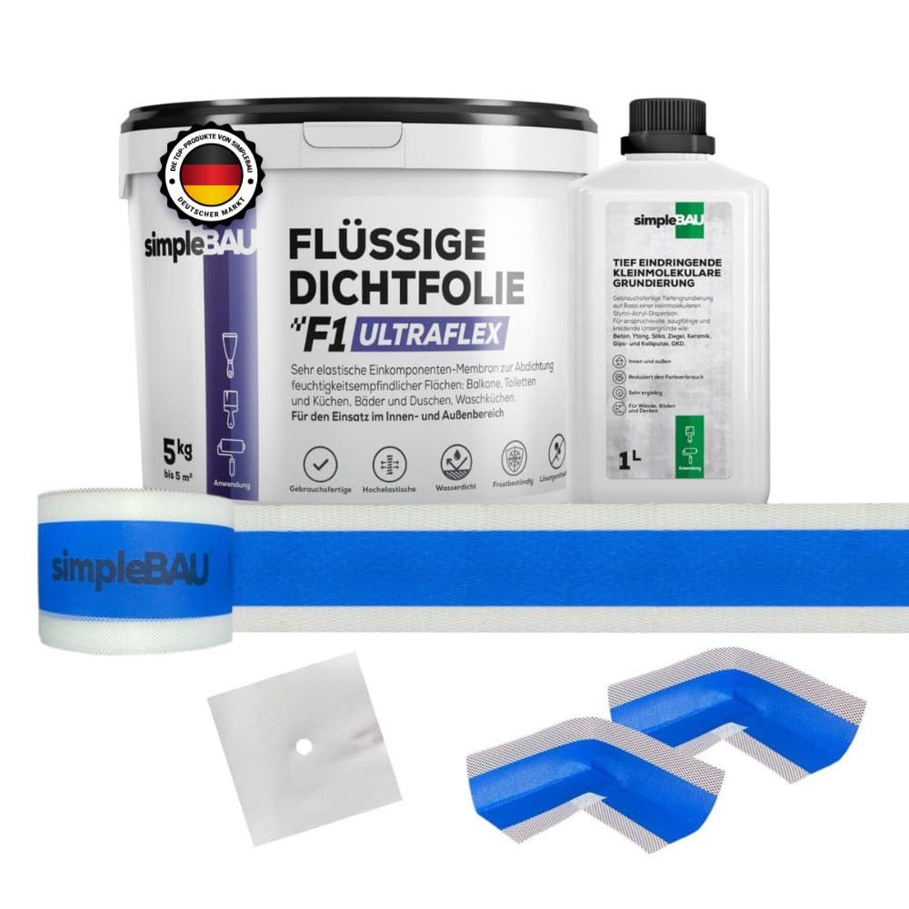 Set beinhaltet | Flüssigfolie Dichtfolie F1 Ultraflex 5kg + Tiefengrund 1L + Dichtband 5m + 2 Innenecken + 1 Wandmanschetten |