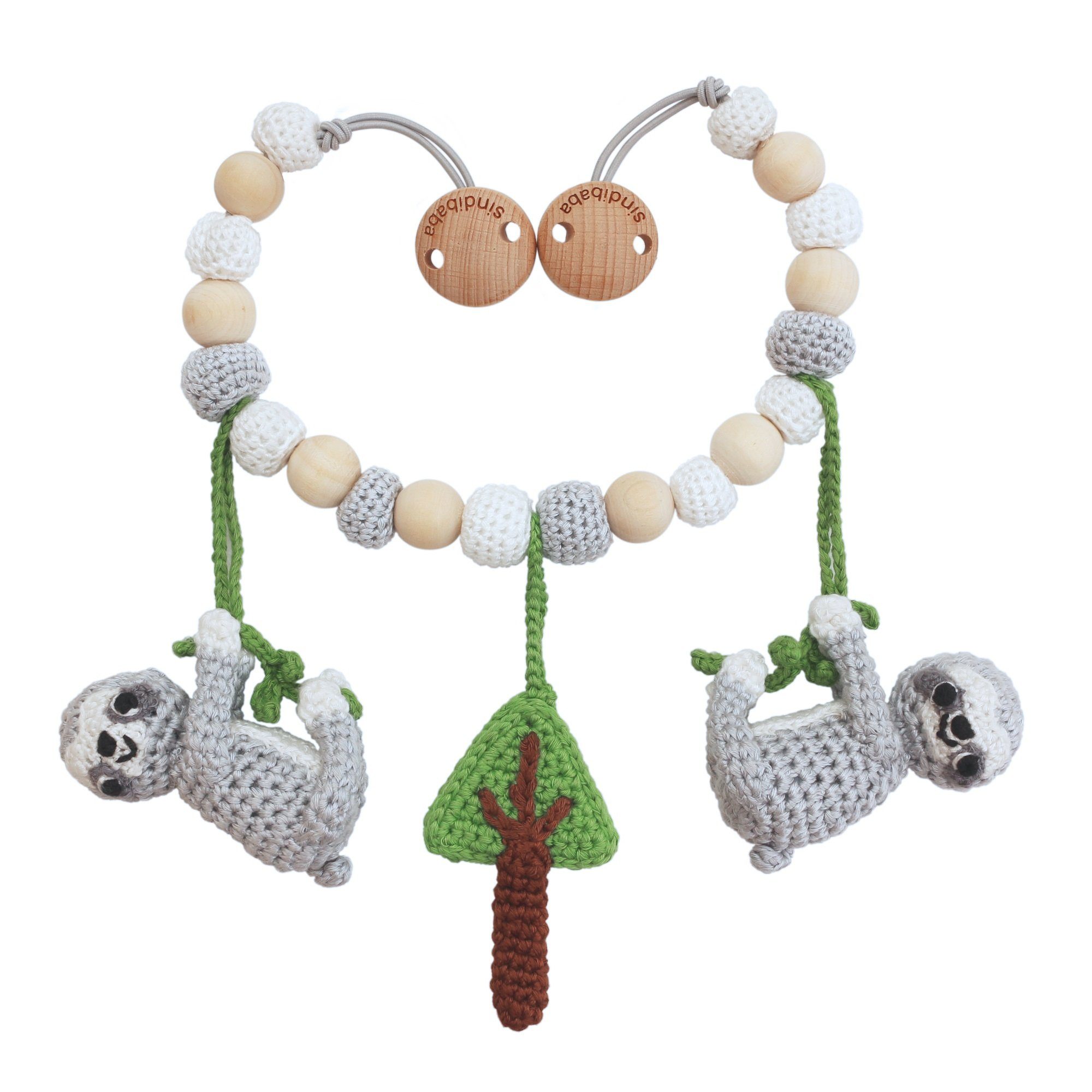 Süße Kinderwagenkette mit gehäkelten Faultieren SLEEPY und kleinem Baum oder Hund LUCKY mit lustigem Knochen, sieht schick aus und passt an jeden Kinderwagen. Ein tolles Geschenk zur Geburt. Die freundlichen Gesichtszüge der beiden Häkel-Faultiere und die kuschelweichen Materialien Kinderwagenkette verzaubern das Babyherz. Ein echtes Unikat und toller Hingucker. SLEEPY & LUCKY haben es sich bequem gemacht. Sie hängen lässig auf einem grünen Ast oder an der Leine und baumeln an der elastischen Wagenkette langsam hin und her. Die Kinderwagenkette hat eine wichtige Aufgabe zu erfüllen: Es zeigt deinem Baby, wie man entspannt in ruhigen Schlaf findet. Es lässt sich aber auch gern befühlen, denn es ist aus kuschelweichem Bambusgarn gehäkelt und daher für kleine Fingerchen gut zu greifen. Wenn Baby mal fest zupackt und an der dehnbaren Kette zieht, fangen SLEEPY & LUCKY an zu rasseln. Somit wird auch das Gehör geschult, während die Beiden hin- und herschwingen. Mit der waschbaren, gehäkelten Kinderwagenkette hast du viele Optionen. Dank der Holzclips befestigst du im Handumdrehen die zwischen 42 und 52 cm einstellbare Kettenschnur an der Wippe, der Babyschale, am Kinderwagen oder am Autositz. Das fröhliche Faultier lässt sich zum Spielen sogar abnehmen. Liebevoll von Hand und Fair Trade produziert.
