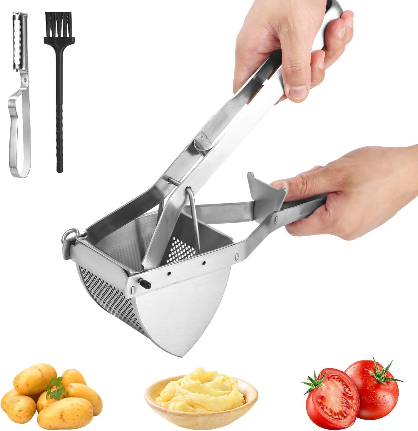 Eine praktische Kartoffelpresse enthält eine Kartoffelmühle aus Edelstahl, einen Multifunktionsschäler und eine Reinigungsbürste. Praktisches Zubehör für Küchenutensilien.