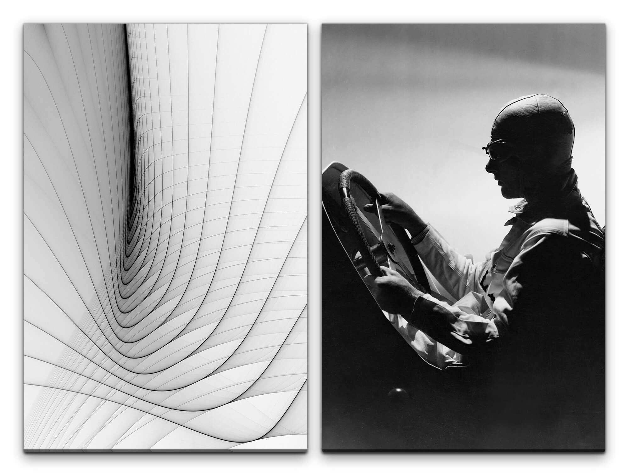 Leinwandbild 2 Bilder je 60x90cm Rennfahrer Schwarz Weiß Abstrakt Schall altes Rennauto Rennen Heroisch