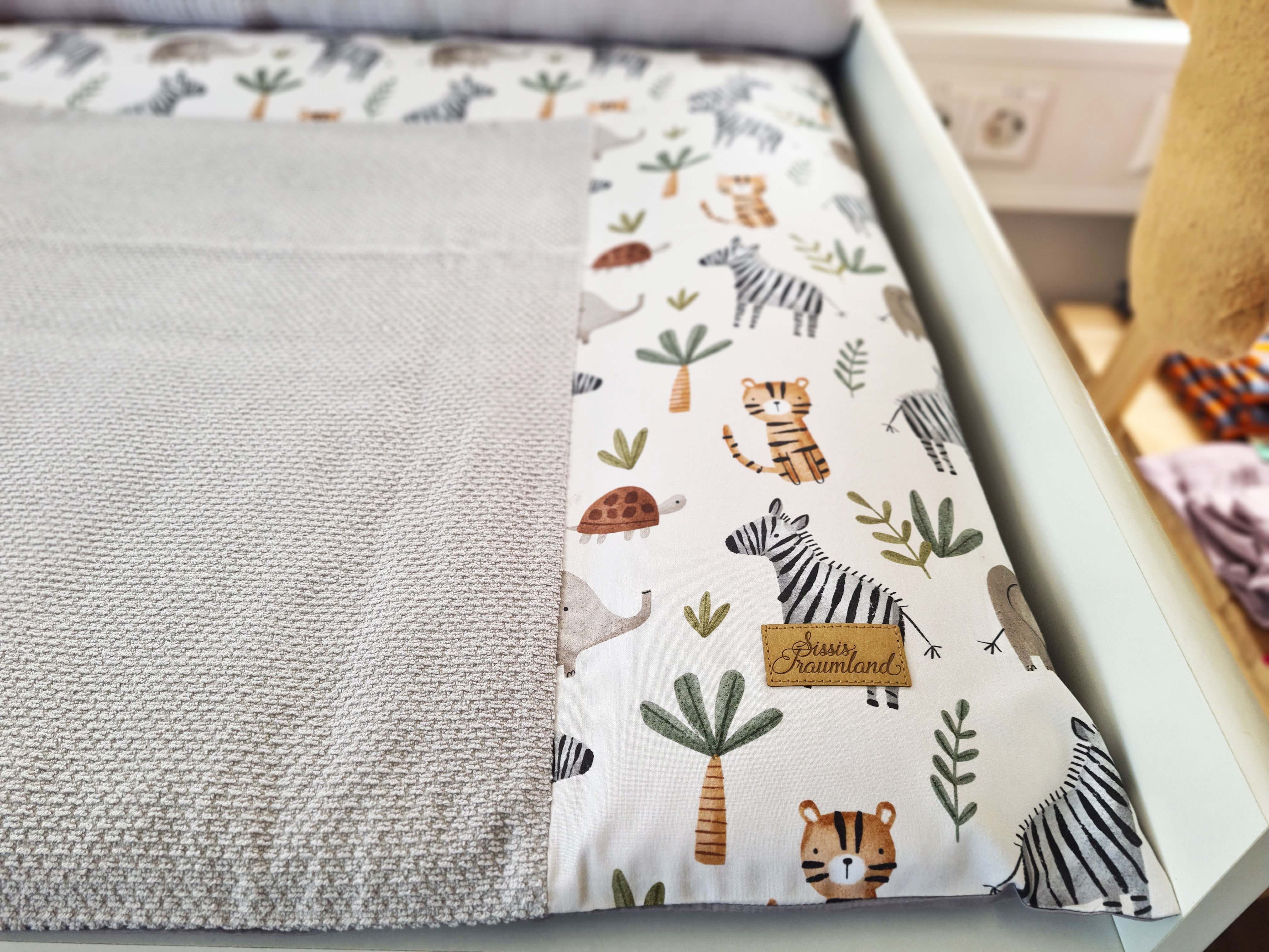 Wir freuen uns, wenn wir für Sie in unserer eigenen Näherei in Baden-Württemberg Ihre Bestellung nähen dürfen. Wir beginnen erst nach dem Bestelleingang mit dem Zuschnitt. Beachten Sie deswegen unbedingt unsere Lieferzeiten! Unsere abnehmbaren Wickelauflagenbezüge haben einen großen Reißverschluss, sodass die Bezüge ganz leicht abgemacht und gewaschen werden können. Der Stoff in der Mitte ist ein hautfreundlicher Waffelstoff. Der angrenzende Stoff ist aus einem ansprechendem Motivstoff mit Waldtieren. Die Rückseite des Bezuges ist aus einem einfarbigem Baumwollstoff. Wir verwenden nur zertifizierte Materialien speziell für Babys. Der Wickelauflagenbezug ist strapazierfähig und weich zu gleich. Im Lieferumfang enthalten ist nur der Bezug nicht die Wickelauflage. Wir bieten auch die dazu passenden Utensilo/Körbchen bei Otto an! Der Bezug ist für Wickelauflagen im Maß 85cm x 75cm geeignet und bei 40° waschbar. Das Muster kann je nach Zuschnitt variieren Auf Grund der Lichtverhältnisse kann es zu leichten Farbabweichungen kommen.