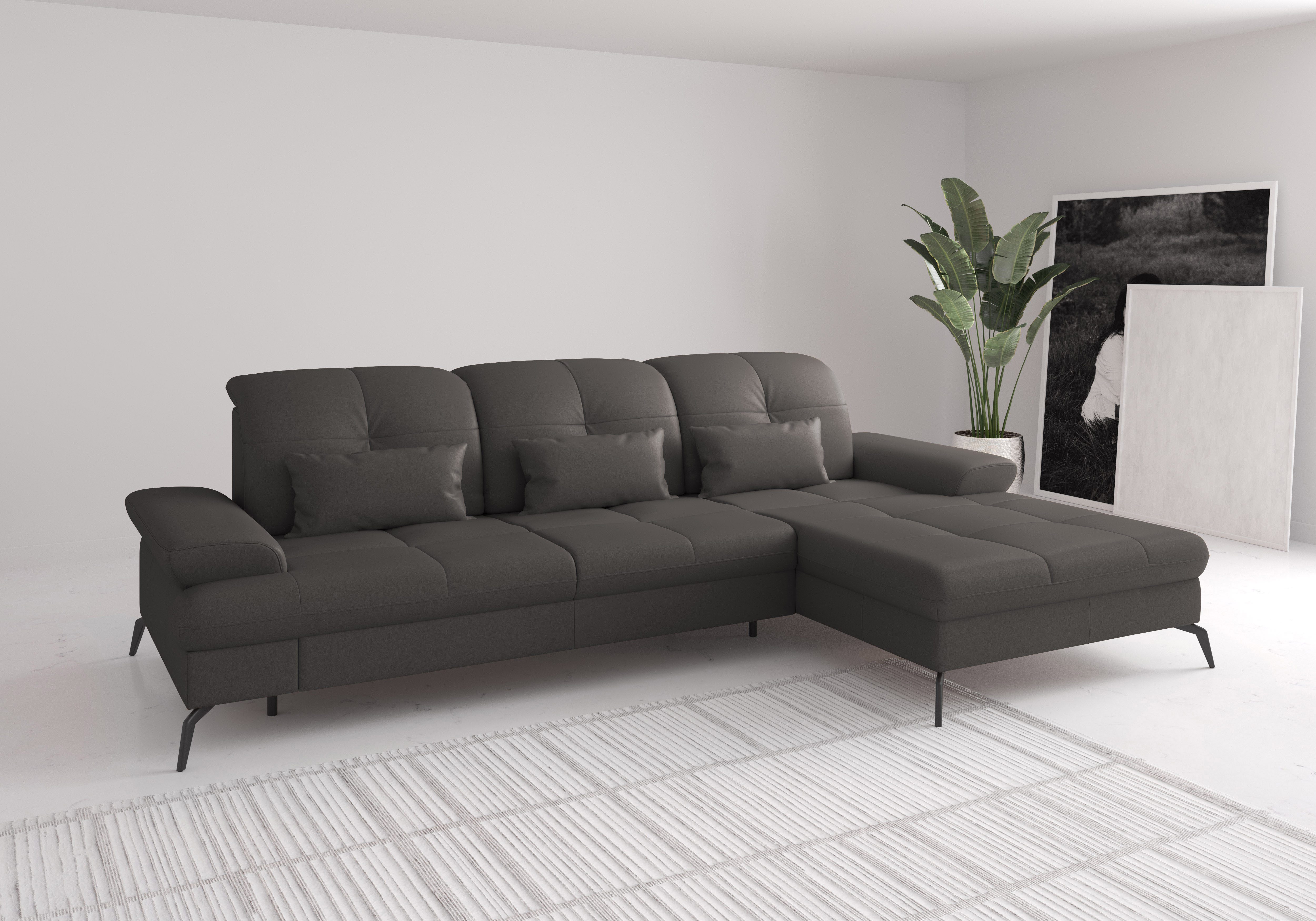 Durch die hochwertige Wellenunterfederung wird die Sitzfläche des Ecksofas »Amica, L-Form, inkl. Sitztiefenverstellung & Armteilverstellung« von sit&more gut gefedert und bleibt dauerhaft elastisch. Das Produkt ist manuell verstellbar, sodass du die Ausrichtung mit einer einfachen Bewegung anpassen kannst. Beim Ecksofa befindet sich die Recamiere, von vorne betrachtet, rechts. Die maximale Belastbarkeit liegt bei einem Gewicht von 360 Kilogramm. Aus Metall gefertigt sind die mattschwarzen Füße besonders widerstandsfähig und langlebig. Aus Liebe zum Detail wurde dieses Modell von Hand angefertigt.