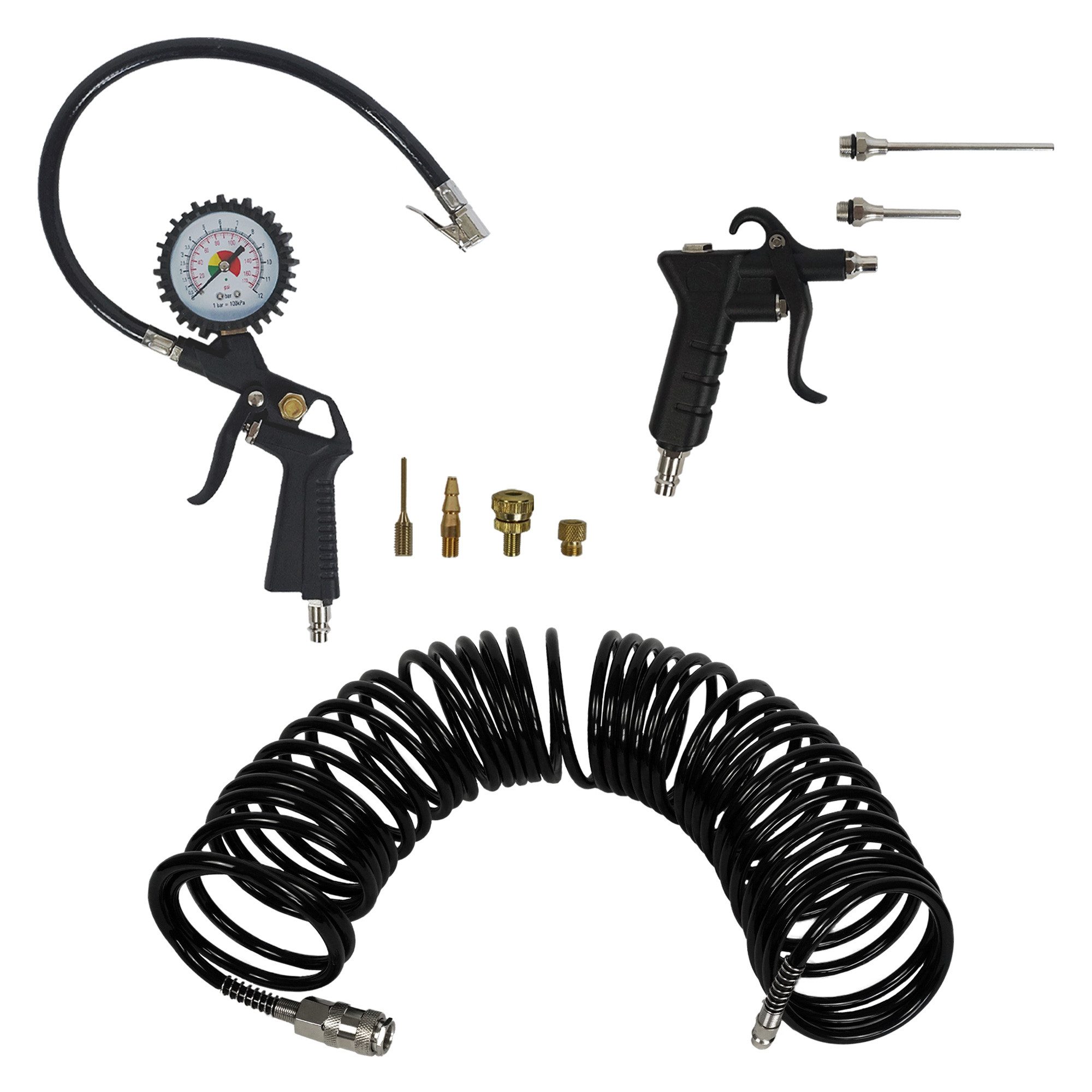Set beinhaltet | 1 x siwitec Druckluftpistole mit 2 Verlängerungen, 1 x siwitec Reifenfüller mit 4 Adaptern, 1 x siwitec Druckluftschlauch in 10 Meter Длина |