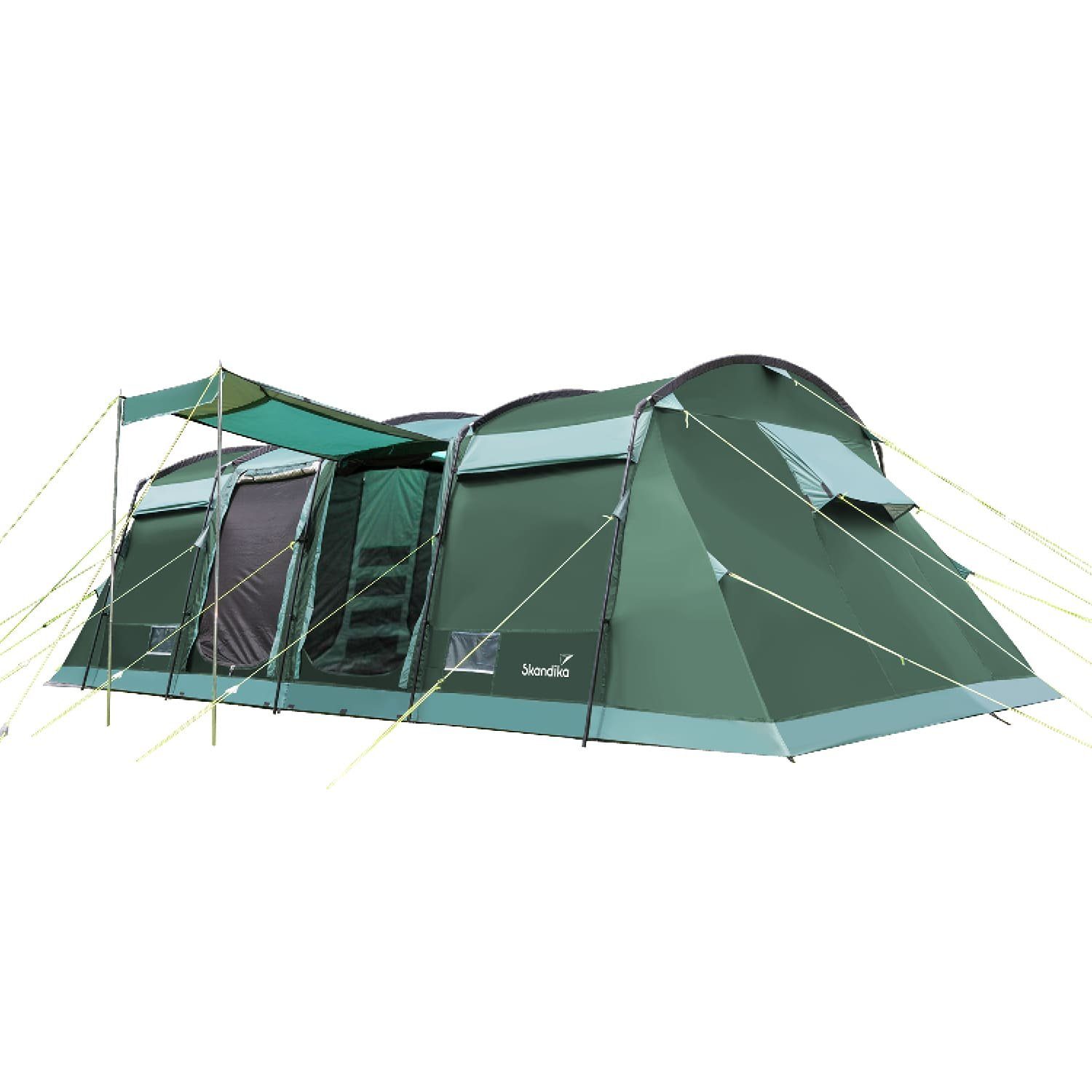 Die Schlafkabinen sind das wahre Highlight des treffend als Montana 10 Sleeper Protect genannten Zeltes. Zwei Schlafkabinen (mit optionaler Zwischenwand) für jeweils bis zu 5 Personen befinden sich auf gegenüberliegenden Seiten des großzügigen Wohnbereichs von 250 x 370 cm (2 m hoch). Bei dieser Version des Montana 10 mit fest eingenähtem Zeltboden und der Skandika Sleeper Technologie wurde eine spezielle Beschichtung auf dem Außenzelt im Bereich der Schlafkabinen aufgetragen.
