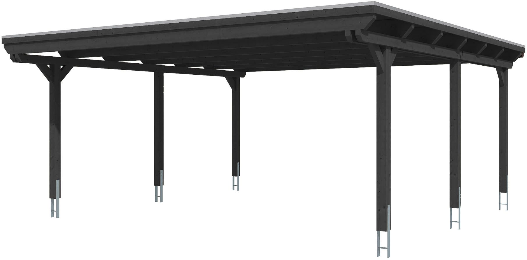 Lieferumfang | 19 mm Dachschalung, EPDM-Folie, Holz-Blende mit Aluminium-Abschlusskante H-Pfostenanker zum Einbetonieren Montagematerial Pfosten 12 x 12 cm Regenrinne mit Fallrohr Vorgefertigter Bausatz aus Leimholz (BSH-Fichte), farblich behandelt |