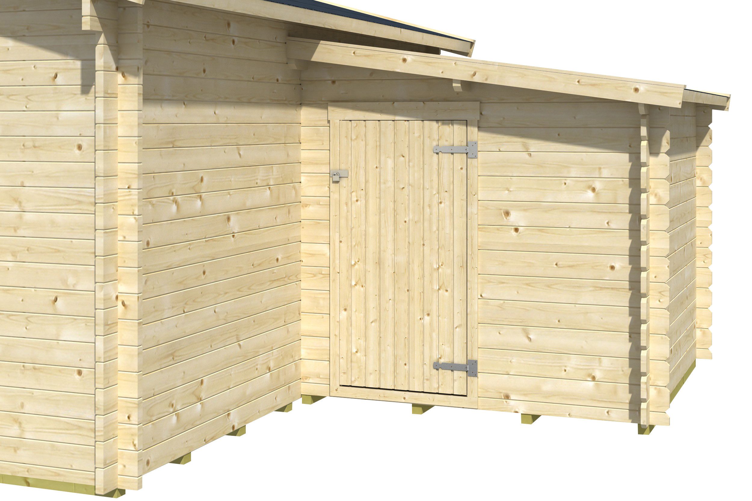 Praktischer SKAN HOLZ Anbauschuppen passend zu 45plus und 70plus Blockbohlenhäusern. Rechts, links oder hinten frei zu positionieren.