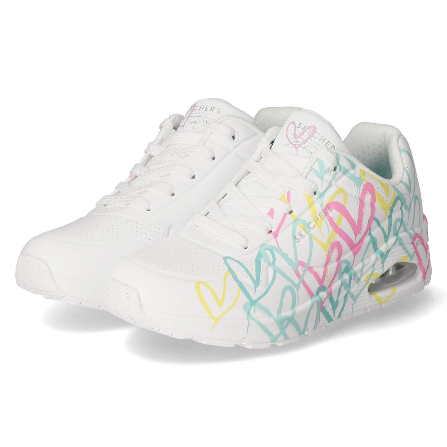 Die Skechers Damen Low Sneaker in Weiß aus Synthetik vereinen sportliches Design mit stilvollen Details. Ein seitlicher, bunter Herzprint und silberfarbene Markendetails verleihen den Schuhen einen verspielten Touch. Die Schnürung sorgt für eine individuelle Passform, während das gelochte Schuhdeck für einen modischen und atmungsaktiven Look sorgt. Der verstärkte Zehen- und Fersenbereich bietet zusätzlichen Schutz und Halt. Ein gepolsterter Einstieg und die Memory Foam Decksohle garantieren hervorragenden Tragekomfort, selbst bei langen Tragezeiten. Die flexible, rutschhemmende Laufsohle mit Sichtfenster sorgt für sicheren Halt und rundet das Design perfekt ab, ideal für den Alltag.