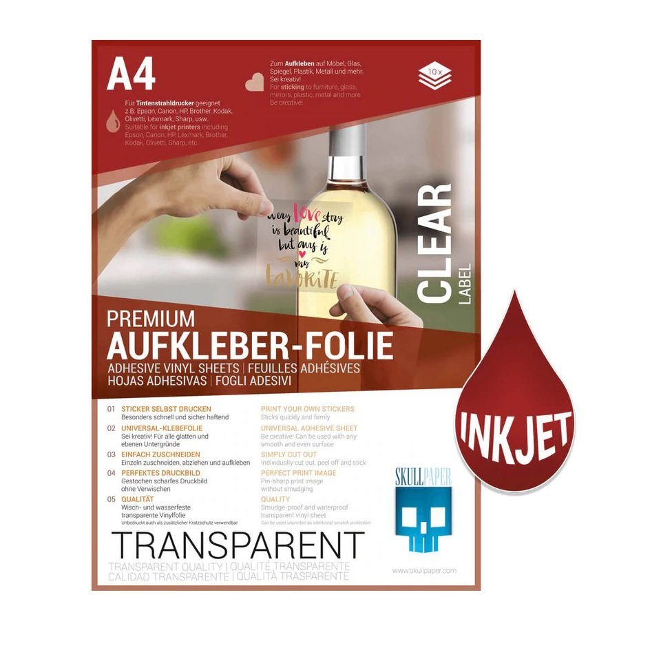 Mit der SKULLPAPER Premium Vinyl-Klebefolie lassen sich nach deinen Ideen und Vorstellung schnell und einfach tolle hochwertige Aufkleber gestalten. Sie hält auf glatten, ebenen Oberflächen wie Möbel, Glas, Spiegel, Plastik, Metall usw. - damit ist der Einsatz vielseitig z. B. für Aufbewahrungsgläser, Fliesen, Kühlschrank oder Dekore, Modellbau und vieles mehr möglich. Egal ob A4-Format oder kleinste Sticker - die Folie lässt sich individuell zuschneiden und ist dazu obendrein wischfest und wasserfest. Entweder du zauberst ein wunderschönes, individuelles Geschenk für Freunde und Familie oder kreierst für dich selbst ein tolles, einzigartiges Produkt, welches niemand sonst besitzt. Die kreative Welt steht dir völlig offen und frei! Für deine kreativen DIY-Ideen verfügbar: Premium Aufkleber-Folie Transferfolie Transparent Tintenstrahldrucker Premium Aufkleber-Folie Transferfolie Transparent Laserdrucker Premium Wasserschiebefolie Transferfolie Transparent Tintenstrahldrucker Premium Wasserschiebefolie Transferfolie Transparent Laserdrucker Premium Wasserschiebefolie Transferfolie Weiss Laserdrucker Premium Textiltransferfolie für helle Stoffe Laserdrucker Premium Textiltransferfolie für dunkle Stoffe Laserdrucker Premium Textiltransferfolie für dunkle Stoffe Tintenstrahldrucker Premium Magnetfolie für Tintenstrahldrucker Premium Tattoo Transferfolie Laserdrucker Premium Tattoo Transferfolie Tintenstrahldrucker